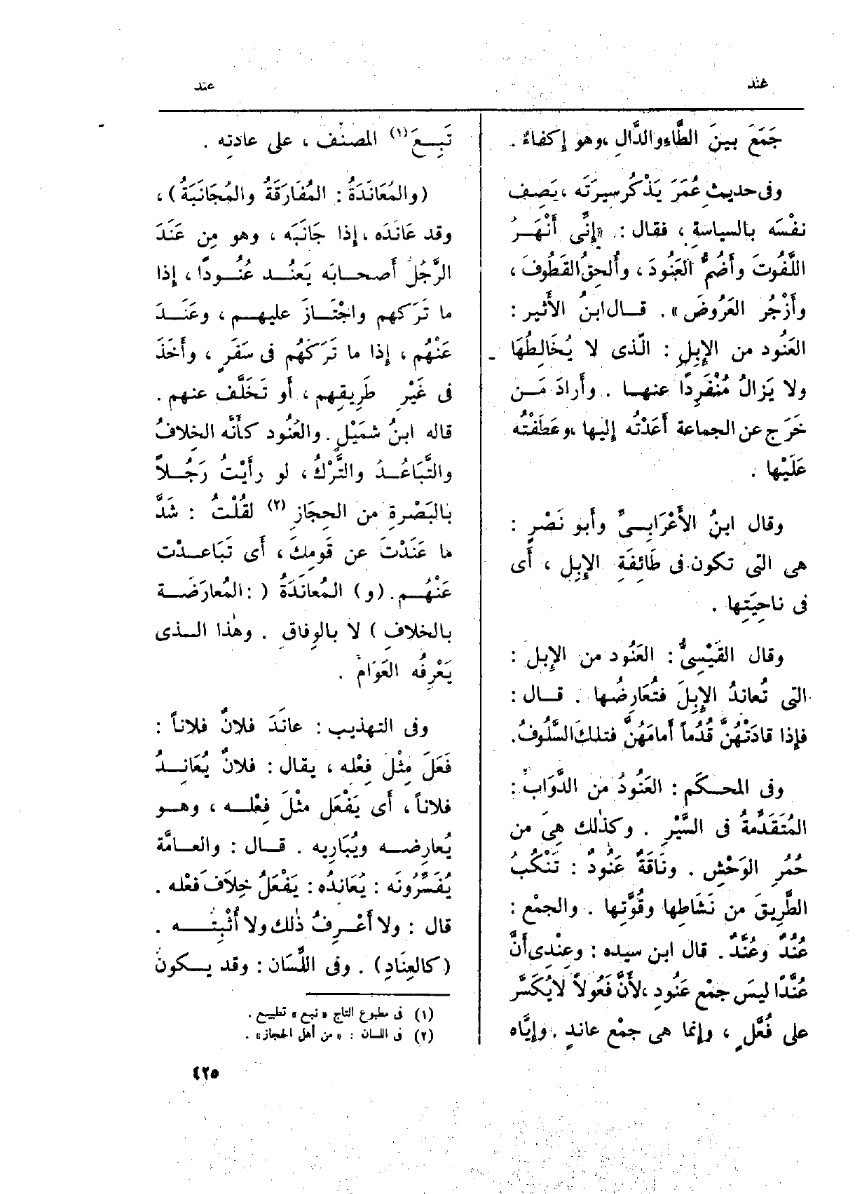 : (عَنَدَ عَنِ) الحَقِّ، والشيْءِ، و (الطَّرِيقِ، كنصَر وسَمِع) هـ كَذَا فِي النُّسخ. والصّواب: وضَرَب. وهاذِه عَن الفَرَّاءِ فِي نوادِرِه، فإِنه قَالَ عَنَدَ عَنِ الطَّرِيقِ يَعْنِد، بِالْكَسْرِ، لُغَة فِي يعنُد، بِالْكَسْرِ، لُغَة فِي يعنُد بالضّمّ، فتأَمَّلْ (وكَرُم) ، يَعْنُد، ويَعنَد، ويَعْنِد (عُنُوداً) كَقُعُودٍ، وعَنَداً، محرَّكةً: تَبَاعَدَ و (مالَ) وعَدَلَ انحرَفَ إِلى عَنَدٍ أَي جانِبٍ.
