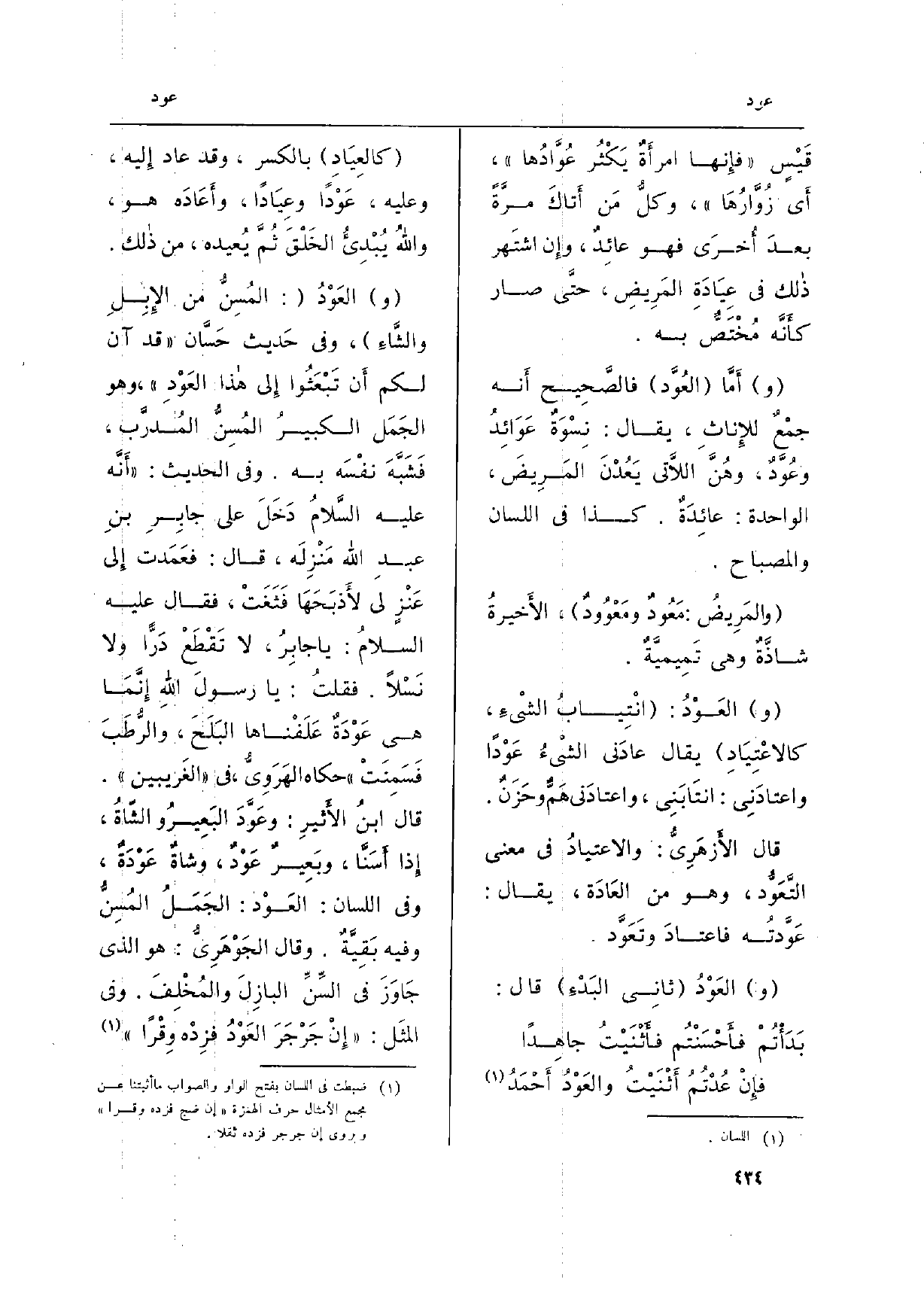 : ( {العَوْدُ: الرُّجُوعُ،} كالعَوْدَةِ) ، عَاد إِليه {يَعُود} عَوْدَة {وعَوْداً: رَجَعَ وَقَالُوا.} عادَ إِلَى الشيْءِ {وعادَ لَهُ وعادَ فِيهِ، بِمَعْنى. وبعضُهُم فَرَّقَ بَين اسْتِعْمَاله بفي وغيرِها. قَالَه شيخُنا.