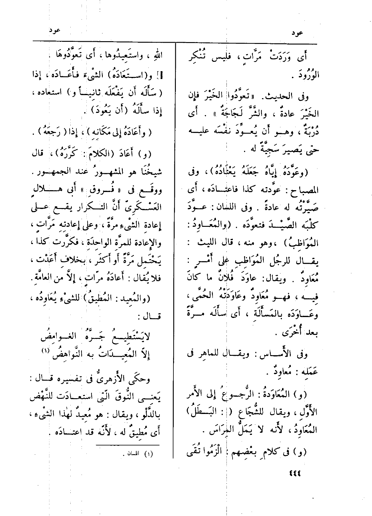 المَعْوَدُ على الأَصل، وَهُوَ مَفْعَلٌ من عادَ يَعُودُ، وَمن حَقِّ أَمثالِه أَن يُقلَب واوُه أَلِفاً كالمَقَام والمَرَاحِ، ولاكِنَّه استَعْمَلَه على الأَصْلِ، تَقول عادَ الشيءُ يَعودُ عَوْداً ومَعَاداً، أَي رَجَعَ. وَقد يَرِدُ بِمَعْنى صَار، كَمَا تقدَّم.
