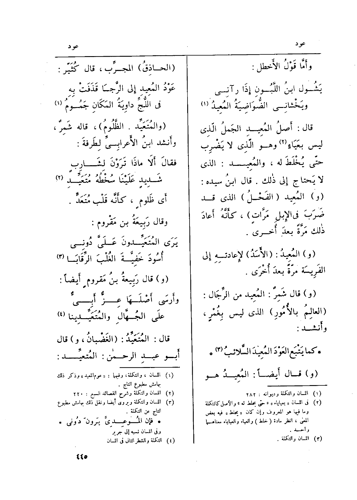 قَالُوا أَكامٌ ونَمَاظٌ وقَضَامٌ. وَقَالَ الجوهَرِيُّ: والعُوَاد، بالضّمّ: مَا {أُعِيدَ من الطَّعَامِ بعدَما أُكِلَ مِنْهُ مَرَّةً، (و) يُقَال: (} عَوَّدَ) ، إِذا (أَكَلَهُ) ، نَقله الصاغانيُّ. ( {والعادةُ: الدَّيْدَنُ) } يُعاد إِليه، معروفَةٌ، وَهُوَ نصّ عبارَة المُحْكَم. وَفِي الْمِصْبَاح: سُمِّيَتْ بذالك لأَنَّ صاحِبَها {يُعَاوِدُهَا، أَي يرجِع إِليها، مرَّةً بعدَ أُخْرَى (ج:} عَادٌ) ، بِغَيْر هاءٍ، فَهُوَ اسمُ جِنْسٍ جَمْعِيّ. وَقَالُوا: {عاداتٌ، وَهُوَ جمْع المؤنّثِ السَّالِم. (} وعِيدٌ) بِالْكَسْرِ، الأَخيرة عَن كُرَاع، وَلَيْسَ بقويَ إِنَّمَا العيدُ: مَا عَاد إِليكَ من الشَّوْقِ والمَرَضِ ونَحْوِه، كَذَا فِي اللِّسَان. وَلَا وَجْهَ لإِنكار شيخِنا لَهُ. وَمن جُموع {الْعَادة:} عَوَائِد، ذَكَرَه فِي الْمِصْبَاح وغيرِه، وَهُوَ نَظِيرُ حوائِجَ، فِي جمْعِ حاجةٍ، نَقله شيخُنا.