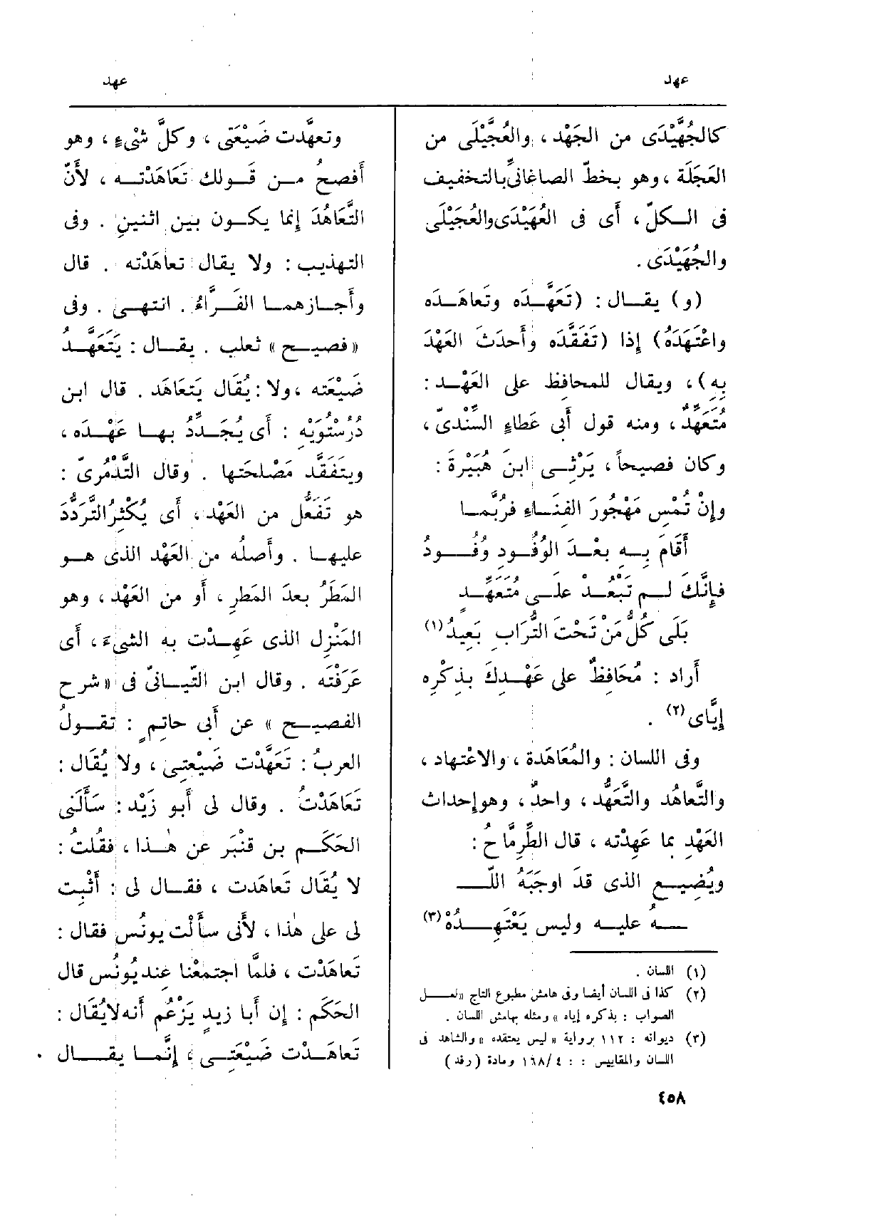 (كالمَعُهَدِ) ، وَهُوَ المَنْزلُ الّذِي لَا يَزَالُ القَوْم إِذا تَنَاءَوْا عَنهُ رَجَعُوا إِليه، وَهُوَ أَيضاً المنزِل الَّذِي كنْت تَعْهَدُ بِهِ هوى لَك، وَيُقَال: استوقَفَ الرّكْبَ على عَهْدِ الأَحِبَّةِ ومَعْهَدِهم، وهاذه مَعاهِدُهم.