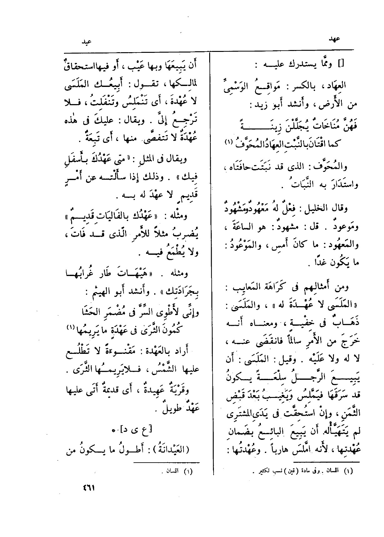 (و) العَهْدُ والعُهْدَة وَاحِد، تَقول: بَرِئْت إِليك من عُهْدةِ هاذا العَبْدِ، أَي مِمَّا يُدْرِكُك فِيهِ من عَيْبٍ كَانَ مَعْهُوداً فِيهِ عِندِي. وَيُقَال: (عُهْدَتُه على فُلانٍ، أَي مَا أُدرِكَ فِيهِ من دَرَكٍ) ، أَي عَيْبٍ (فإِصلاحُهُ عَلَيْهِ) .