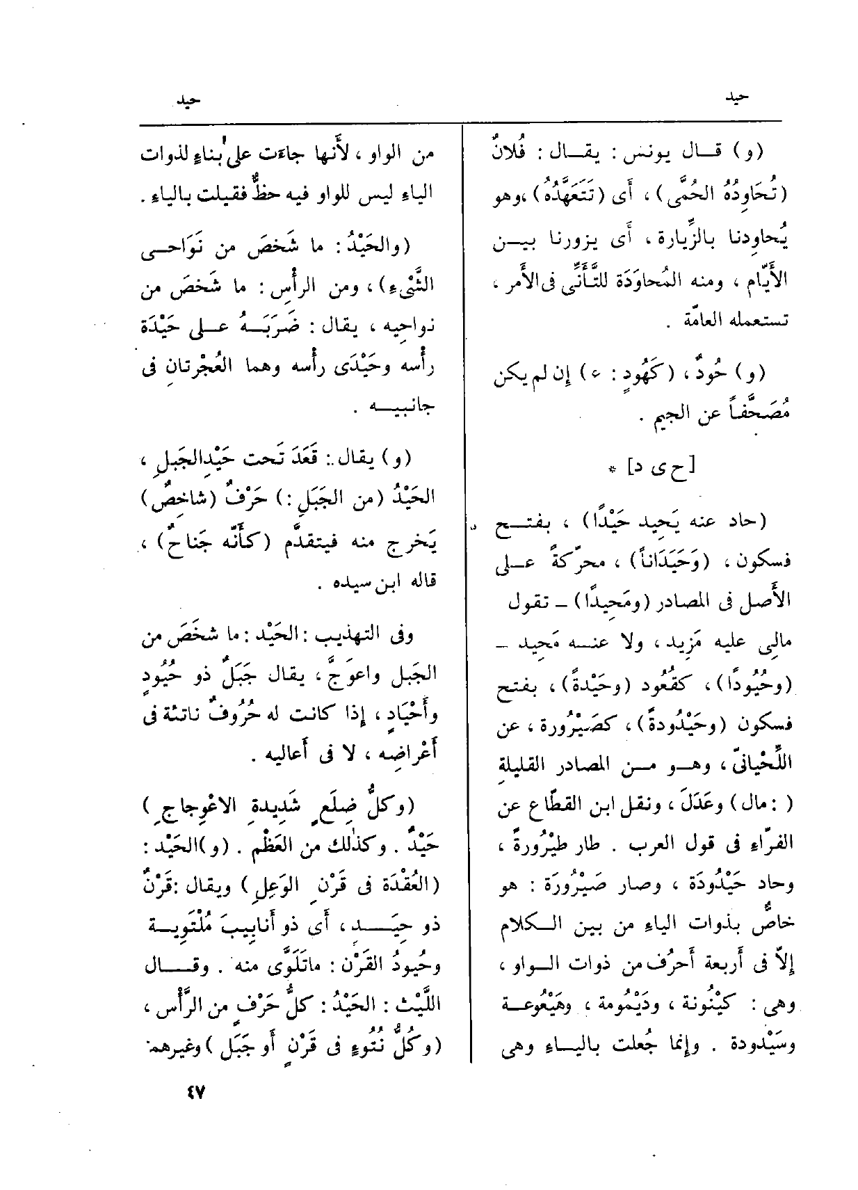 : ( {حاد عَنهُ} يحِيد {حَيْداً) ، بِفَتْح فَسُكُون، (} وَحَيَدَاناً) ، محرّكةً على الأَصل فِي المصادر ( {ومَحِيداً) تَقول مالِي عَلَيْهِ مَزِيد، وَلَا عَنهُ مَحِيد (} وحُيُوداً) ، كقُعُود ( {وحَيْدةً) ، بِفَتْح فَسُكُون (} وحَيْدُودةً) ، كصَيْرُورة، عَن اللِّحْيانيّ، وَهُوَ من المصادر القليلةِ: (مَال) وعَدَلَ، وَنقل ابْن القطّاع عَن الفرّاءِ فِي قَول الْعَرَب. طَار طيْرُورةٌ، {وحاد} حَيْدوُدَة، وَصَارَ صَيْرُورَة: هُوَ خاصٌّ بذوات الياءِ من بَين الْكَلَام إِلّا فِي أَربعة أَحرُف من ذَوَات الْوَاو، وَهِي: كيْنُونة، ودَيْمُومة، وهَيْعُوعة وسَيْدودة. وإِنما جُعِلت بالياءِ وَهِي من الْوَاو، لأَنها جاءَت على بناءٍ لذوات الياءِ لَيْسَ للواو فِيهِ حظٌّ فقيلت بالياءِ.
