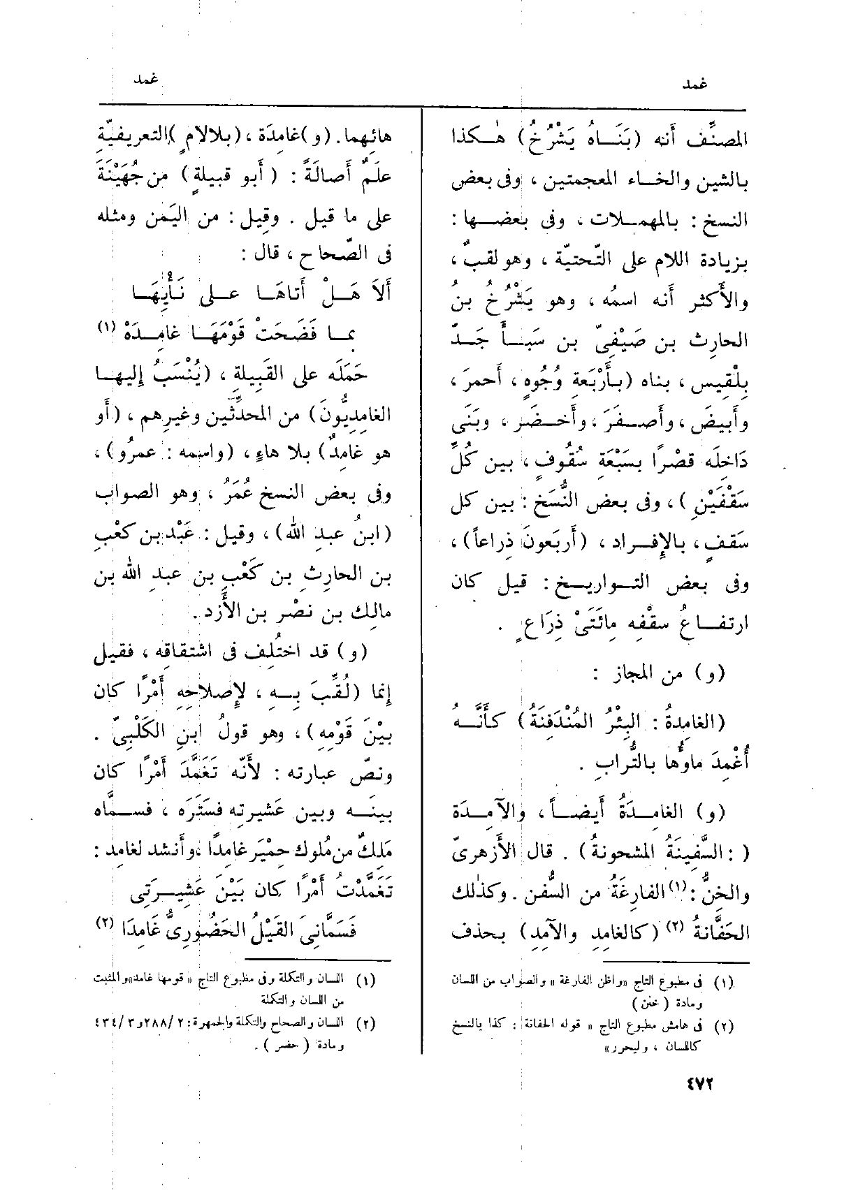 كتاب م كتاب (وبَرْكُ الغمَاد، مثلثةَ الغَيْنِ) ، وصَرَّح بالغَيْن، وإِن كَانَت المادَّةُ كالنَّصّ فِي المُراد، دَفعاً لِما عَسَى أَن يَخْطُر بالبالِ من الإِيراد، وبَرْك، بِالْفَتْح، وَيكسر، وسيأْتي فِي الْكَاف وَقد اختُلف فِي ضَبْط الغماد. فَرَوَاه قومٌ بالضَّمّ، وَنسبه صاحِبُ (المراصد إِلى ابْن دُرَيْد، وَحَكَاهُ جماعةٌ عَن ابْن فارِسٍ، وَآخَرُونَ بِالْكَسْرِ. و (الفتْحُ عَن القَزَّازِ) فِي (جامعِه) . وَفِي بعض النُّسخ: الفَرْاءِ. قَالَ ابْن خَالَوَيْه. حضَرتُ مَجْلِسَ أَبي عبدِ الله محمْدِ بنِ إسماعيلَ القاضِي المحَاملِيّ، وَفِيه زُهاءُ أَلْفٍ فأَمْلَى عَلَيْهِم، أَنَّ الأَنصار قَالُوا للنَبيِّ صلَّى الله عليْه وسلّم: واللهِ مَا نَقُول لكَ مَا قالَ قَوْمُ مُوسَى لموسَى: {8. 029 5؟ 24؟ 10. . 16} (الْمَائِدَة: 24) بل نَفْدِيك بآبائِنا وأَبنائِنا، وَلَو دَعَوْتَنا إِلى بَرْكِ الغِمَادِ) بِكَسْر الْغَيْن. قلتُ للمُسْتَمْلِي: قَالَ النحويُّ: