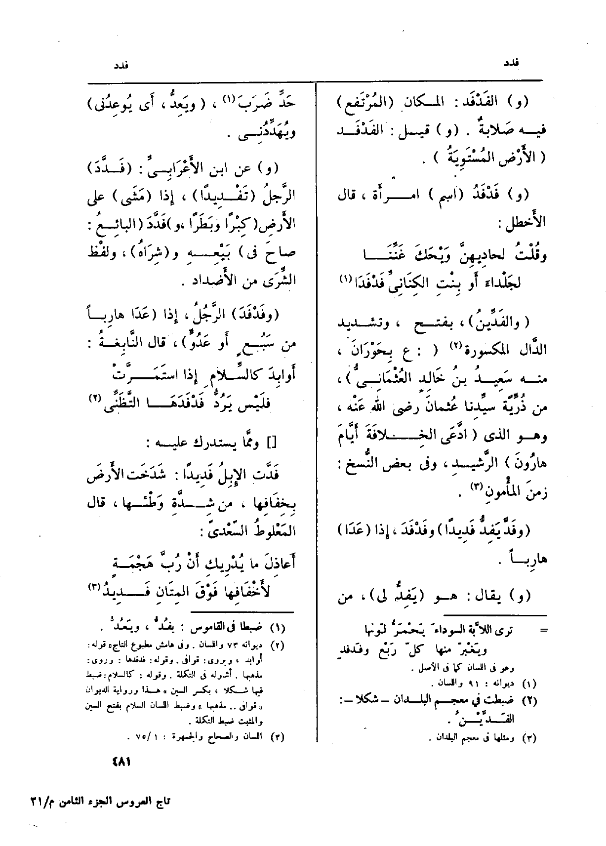 أَرادَ أَنَّهما كَانَ يَعْدُوَانِ فَيُسْمَعُ لِعَدْوِهِم اصَوتٌ. (أَو) الفَدِيدُ (صَوْتٌ كالحَفِيفِ) ، بالحاءِ الْمُهْملَة، (وَكَذَا {الفَدْفَدَةُ، وَقد} فَدَّ {يَفِدُّ) ، من حَدِّ ضَرَبَ، (فِي الكُلِّ) ، أَي مِمَّا تقدَّم من المعانِي المذكورةِ،} فَدًّا، {وفَدِيداً} وفَدْفَدةً.