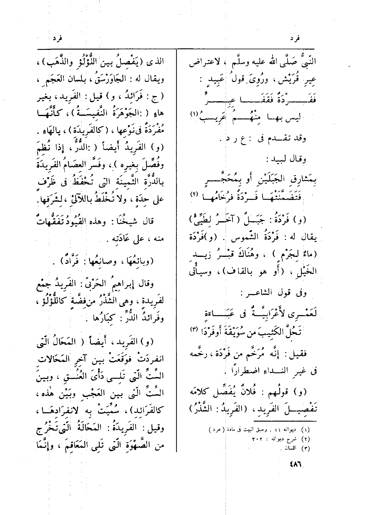 (وفَردَ بالأَمرِ، مثلْثَةَ الرّاءِ) ، الفتحُ هُوَ الْمَشْهُور، قَالَ ابنُ سِيدَه: وأُرى اللِّحْيَانيَّ حكَى الكَسْرَ والضّمَّ. وَأَفْرَدَ، وانفَرَدَ، واستَفْرَدَ) ، إِذا (تَفَرَّدَ بِهِ) ، وَقَالَ أَبو زَيْدٍ: فَرَدْتُ بهاذا الأَمْرِ أَفرُدُ بِهِ فُرُداً، إِذا انفرَدْت بِهِ (و) قولُهم: (جاءُوا فُرَاداً وفِرَاداً) بالضّمّ وَالْكَسْر مَعَ التَّنْوِين، (وفُرادَى) كسُكَارَى، (فُرَادَ) ، كثُلاثَ ورُبَاعَ، (وفَرَادَ) ، بِالْفَتْح، غَيْرَ منصرفَيْنِ، (وفَرْدَى كسَكْرَى، أَي واحِداً بَعْدَ واحِدٍ) ، قَالَ أَبو زَيْدٍ عَن الكِلابِيِّين: جِئْتُمُونا فُرَادى، وهم فُرَادٌ وأَزواجٌ، نَوَّنوا قَالَ: وأَما قَوْله تَعَالَى: {وَلَقَدْ جِئْتُمُونَا فُرَادَى} (الْأَنْعَام: 94) فإِنَّ الفَرَّاءَ قَالَ: فُرَادَى جمْعٌ، قَالَ: وَالْعرب تَقول: قَوْمٌ فُرَادَى، وفُرَادَ، فَلَا يُجْرُونها، شُبِّهَتْ بثُلَاثَ ورُبَاعَ، قَالَ: (والوَاحِدُ: فَرَدٌ) ، بِالتَّحْرِيكِ، (وفَرِدٌ) ككَتفٍ، (وفَرِيد) ، كأَمِير، (وفَرْدَانُ) كسَكْرَانَ، (وَلَا يَجُوزُ فَرْدٌ فِي هَذَا الْمَعْنى) ، أَي بفتْح فَسُكُون، قَالَ