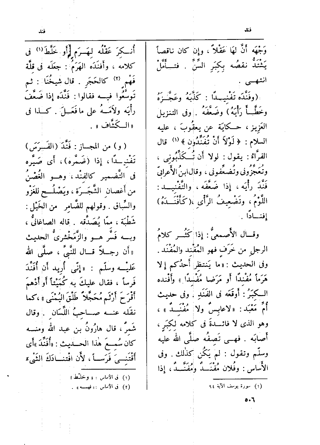 وَفِي قولِ عليَ رَضِيَ الله عَنْه للأَشْتَرِ: (لَو كانَ جَبَلاً لَكَانَ فِنْداً لَا يَرتَقِيه الحافِرُ، وَلَا يُوفِي عَلَيْهِ الطَّائرُ) قَالَ ابنُ أَبي الحَديدِ فِي شرْح (نَهْج البَلاغة) : الفِنْد: هُوَ المُنْفَرِد من الجِبَالِ. والجَمْع أَفنادٌ. (ويُفْتَحُ) ، وهاذه عَن الصاغانيِّ.