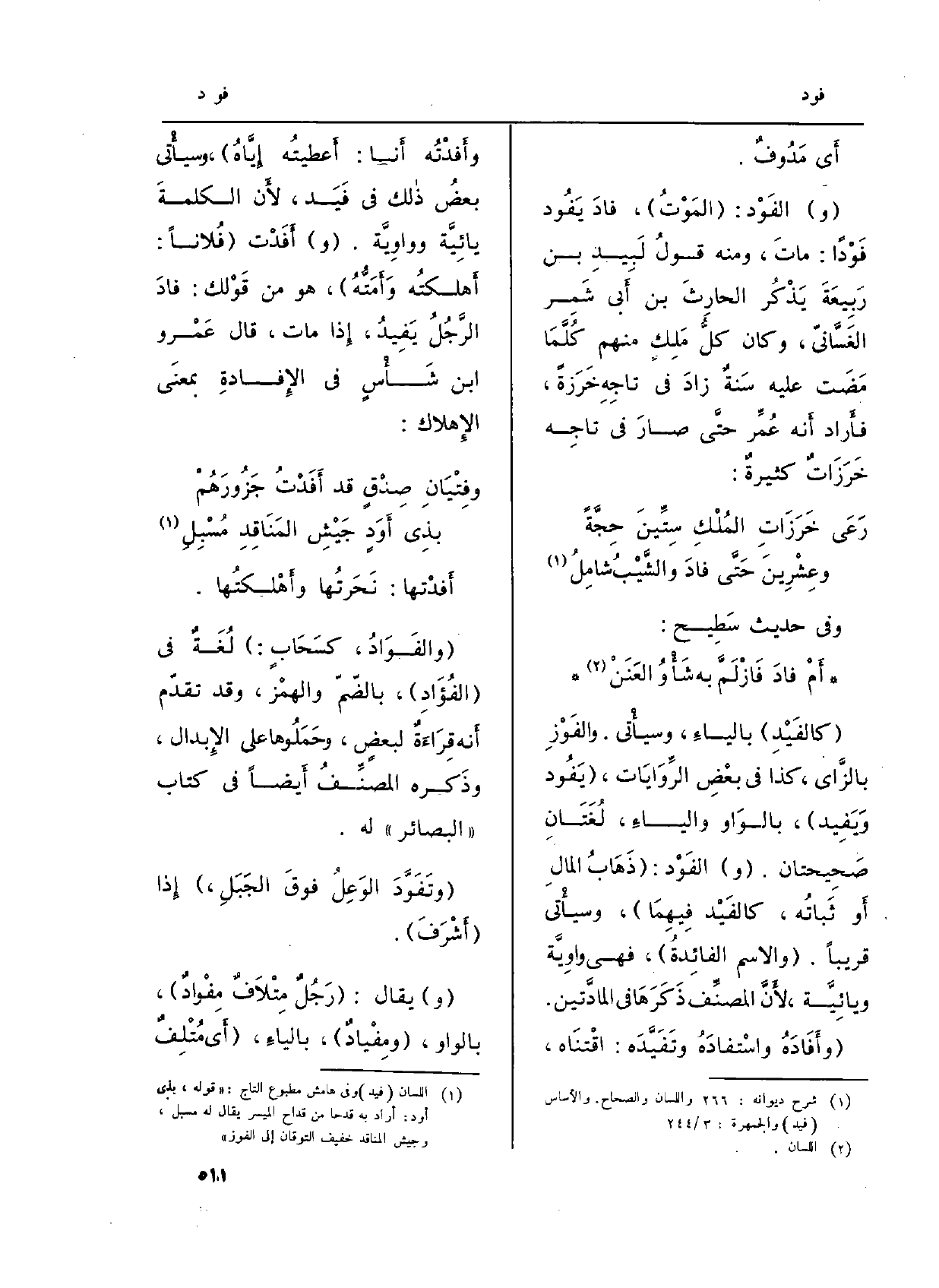 وَفِي (النِّهَايَة) : أَي جَماعاتٍ مُتفرِّقينَ، قوْماً بعدَ قَومٍ، وحدهم فِنْدٌ. وَفِي حديثِ عائِشَةَ، رَضِيَ اللهُ عَنْهَا (أَن النَّبيَّ، صلَّى الله عليْه وسلَّم قَالَ: أَسْرَعُ الناسِ بِي لُحُوقاً قَوْمِي، تَستَجْلِبهم المَنَايَا، وتَتنافَسُ عَلَيْهِم أُمَّتُهُم وَيعِيشُ النّاسُ بَعْدَهم أَفناداً يَقْتُلُ بعْضُهم بَعْضًا) . قَالَ أَبو مَنْصُور: مَعْنَاهُ أَنهم يَصيرون فِرَقاً مُختلِفِينَ، يَقتُلُ بعضُهم بَعْضًا، قَالَ: هم فِنْدٌ على حِدَةٍ، أَي فِرْقَة على حِدَةٍ.