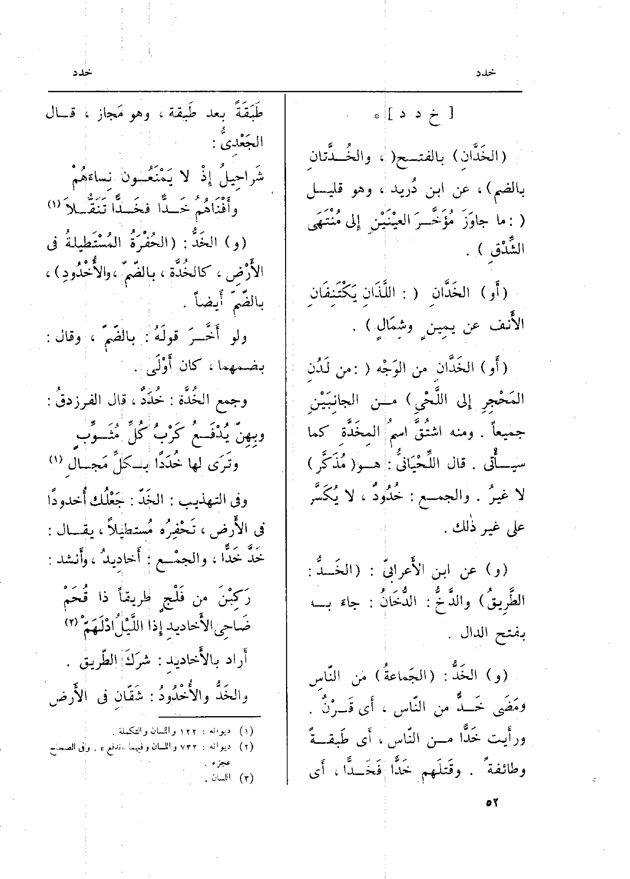 (و) الخَدُّ: (الجَماعةُ) من النّاسِ ومَضَى} خَدٌّ من النّاس، أَي قَرْنٌ. ورأَيت {خَدًّا من النّاس، أَي طَبقةً وَطَائِفَة. وقَتلَهم} خَدًّا. {فَخَدًّا، أَي طَبَقَة بعد طَبقة، وَهُوَ مَجاز، قَالَ الجَعْدِيُّ: