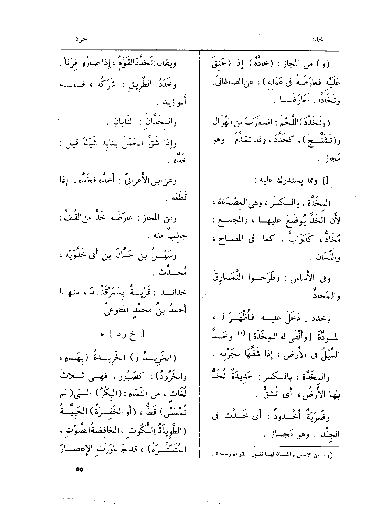 {وخدد. دَخَلَ عَلَيْهِ فأَظْهَرَ لَهُ المودَّةَ (وأَلْقَى لَهُ} المِخَدّة) وخَدَّ السَّيْلُ فِي الأَرض، إِذا شَقَّهَا بجَرْيِه.
