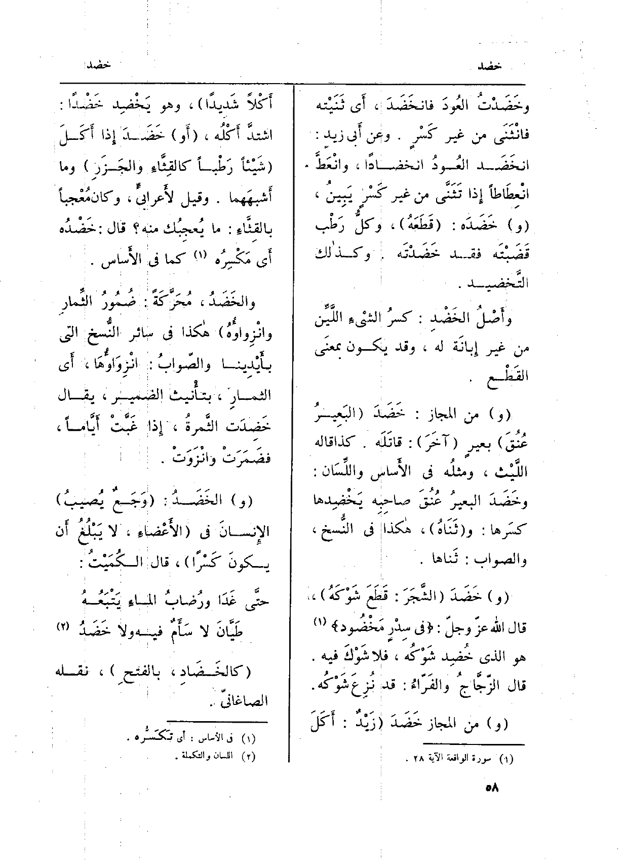 (و) خَضَدَ (الشَّجَرَ: قَطَعَ شَوْكَهُ) ، قَالَ الله عزّ وجلّ: {فِى سِدْرٍ مَّخْضُودٍ} (الْوَاقِعَة: 28) هُوَ الَّذِي خُضِد شَوْكُه، فَلَا شَوْكَ فِيهِ. قَالَ الزّجَّاجُ والفَرّاءُ: قد نُزِعهَ شَوْكّه.
