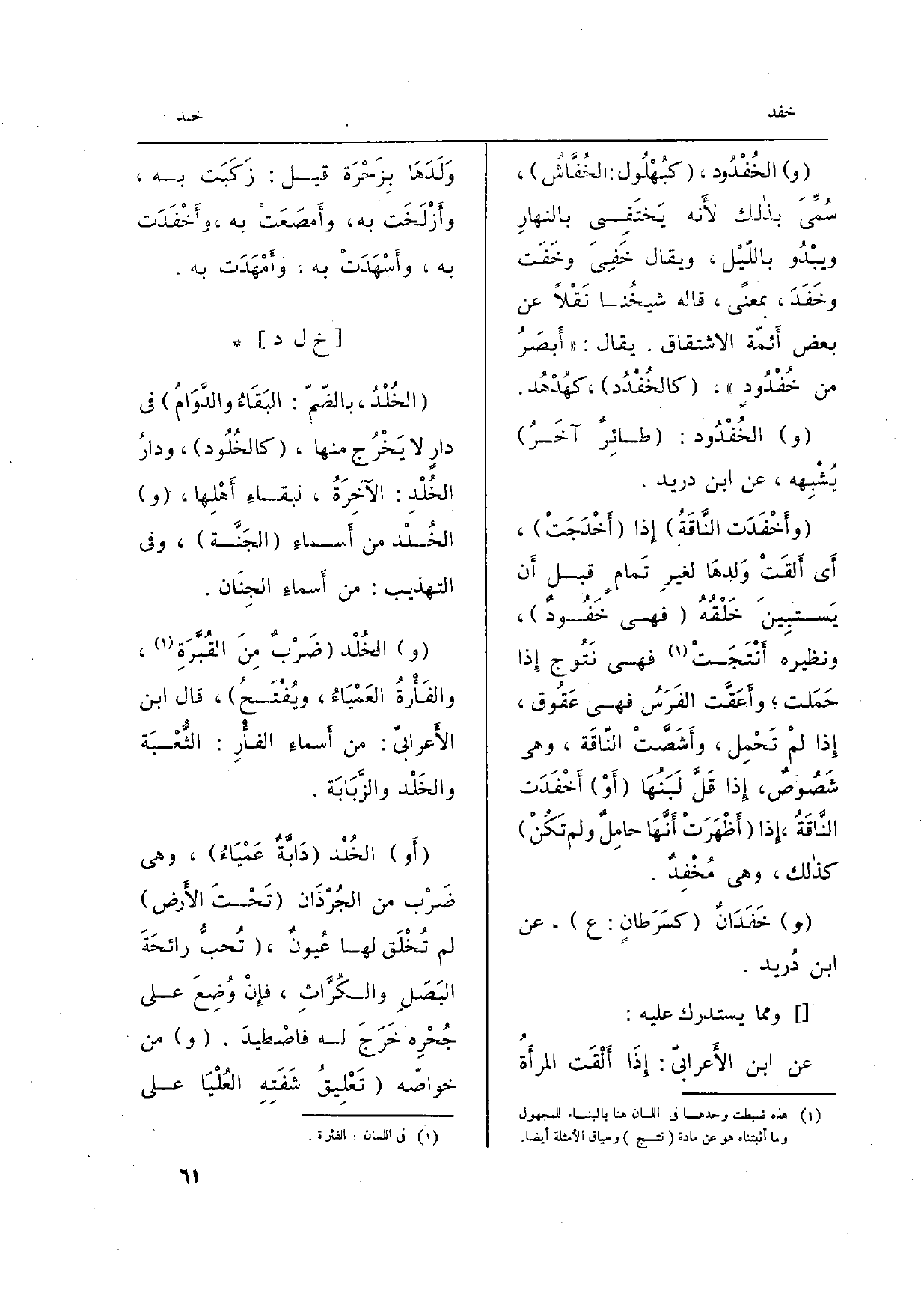 (و) الخُفْدُود، (كبُهْلُول: الخُفَّاشُ) ، سُمِّي بذالك لأَنه يَختَفِي بِالنَّهَارِ ويبْدُو باللّيْل، وَيُقَال خَفِيَ وَخفت وخَفَدَ، بِمَعْنى، قَالَه شيخُنا نَقْلاً عَن بعض أَئمّة الِاشْتِقَاق. يُقَال: (أَبصَرُ من خُفْدُودٍ) ، (كالخُفْدُد) ، كهُدْهُد.
