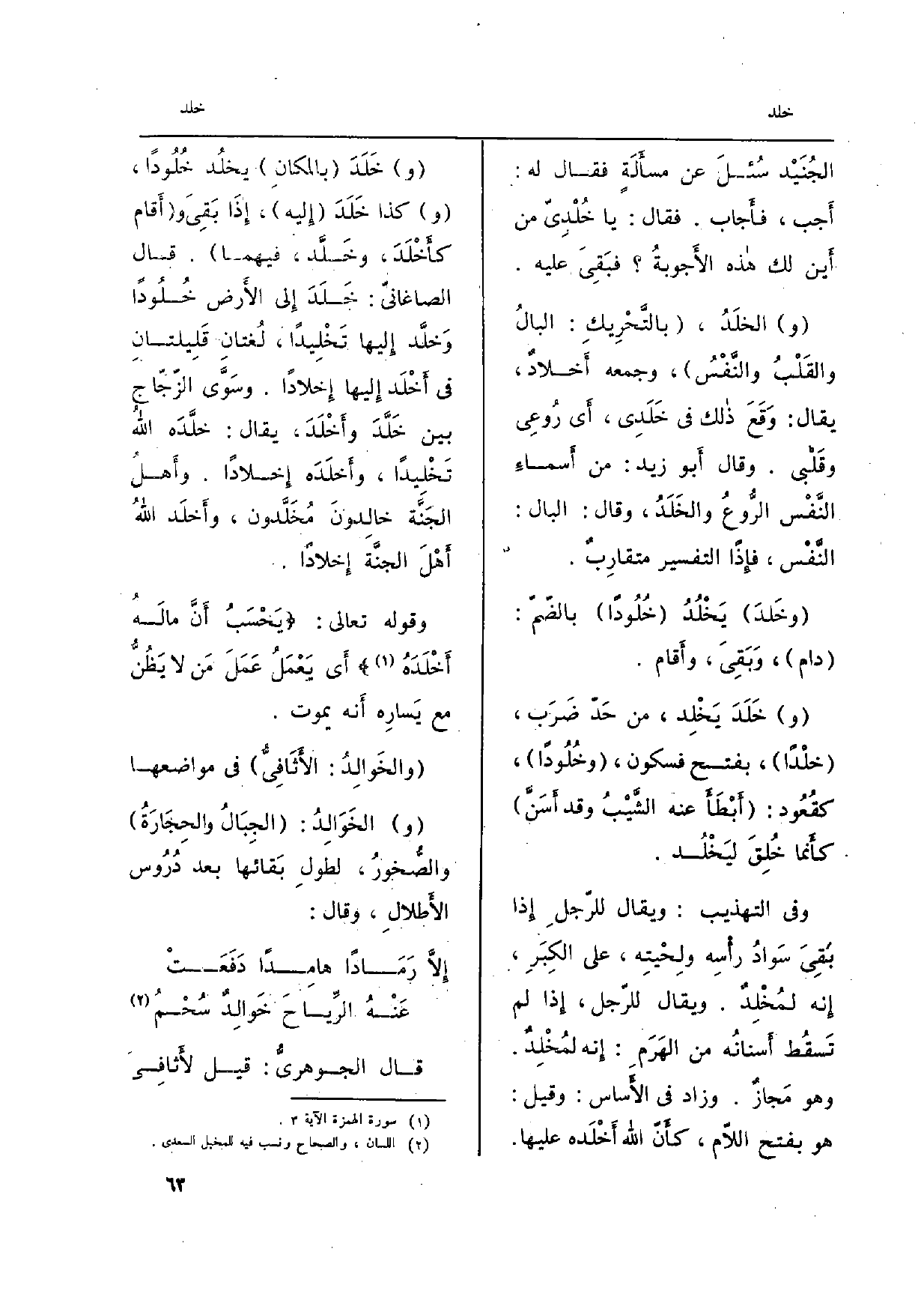 (و) خَلَدَ (بالمكانِ) يخلُد خُلُوداً، (و) كَذَا خَلَدَ (إِليه) ، إِذَ بَقِيَ و (أَقام كأَخْلَدَ، وخَلَّد، فيهمَا) . قَالَ الصاغانيّ: خَلَدَ إِلَى الأَرض خُلُوداً وَخلَّد إِلَيْهَا تَخْلِيداً، لُغتانِ قَلِيلتانِ فِي أَخْلَد إِليها إِخلاداً. وسَوَّى لزّجّاج بَين خَلَّدَ وأَخْلَدَ، يُقَال: خلَّدَه اللهُ تَخْلِيداً، وأَخلَدَه إِخلاداً. وأَهلُ الجَنَّة خالِدونَ مُخَلَّدون، وأَخلَد اللهُ أَهْلَ الجنَّة إِخلاداً.