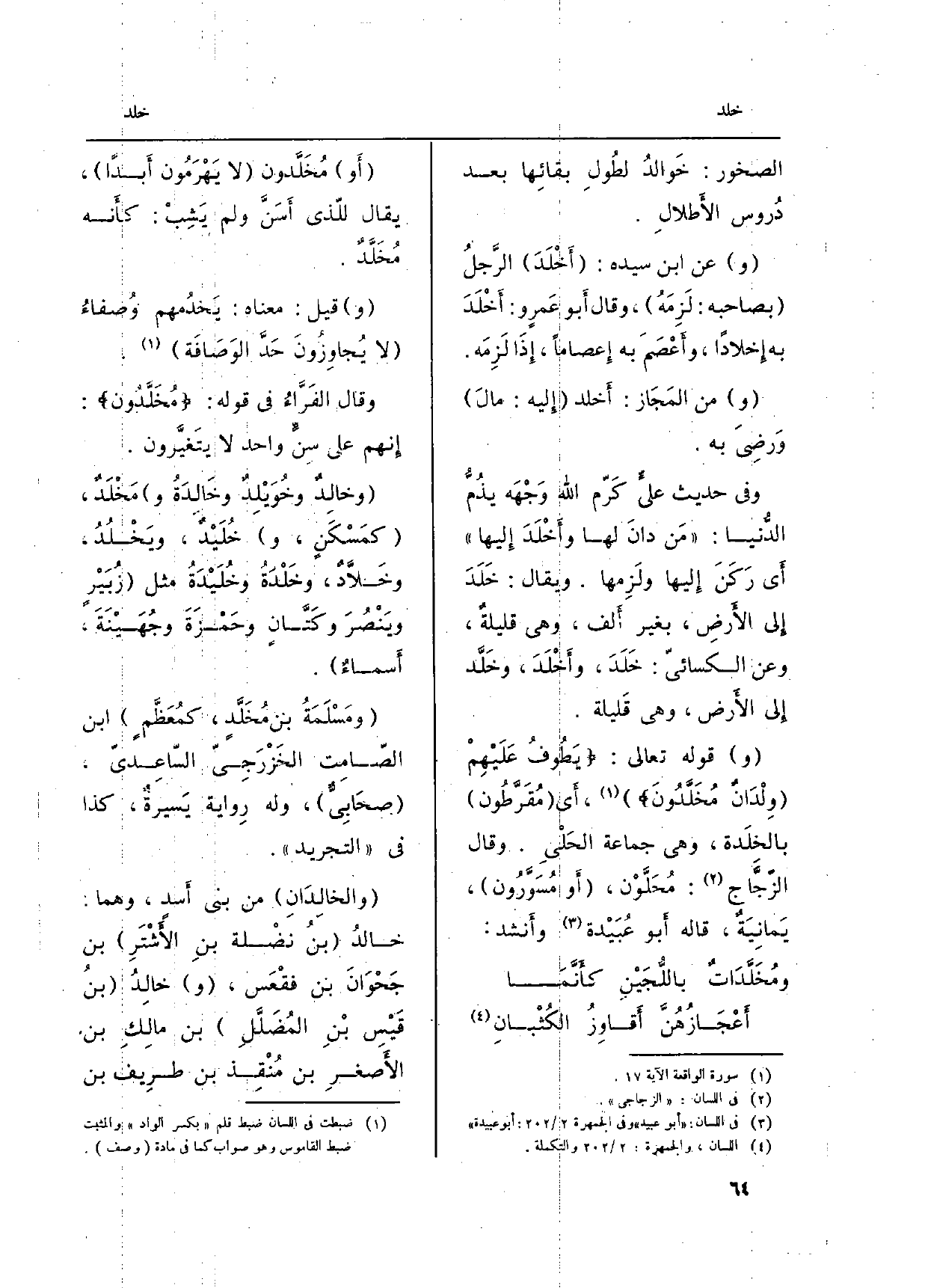 (و) قَوْله تَعَالَى: {يَطُوفُ عَلَيْهِمْ وِلْدانٌ مُّخَلَّدُونَ} (الْوَاقِعَة: 17) ، أَي (مُقَرَّطُون) بالخِلَدة، وَهِي جمَاعَة الحَلْي. وَقَالَ الزّجَّاج: مُحَلَّوْن، (أَو مُسَوَّرُون) ، يَمانِيَةٌ، قَالَه أَبو عُبَيْدة وأَنشد: