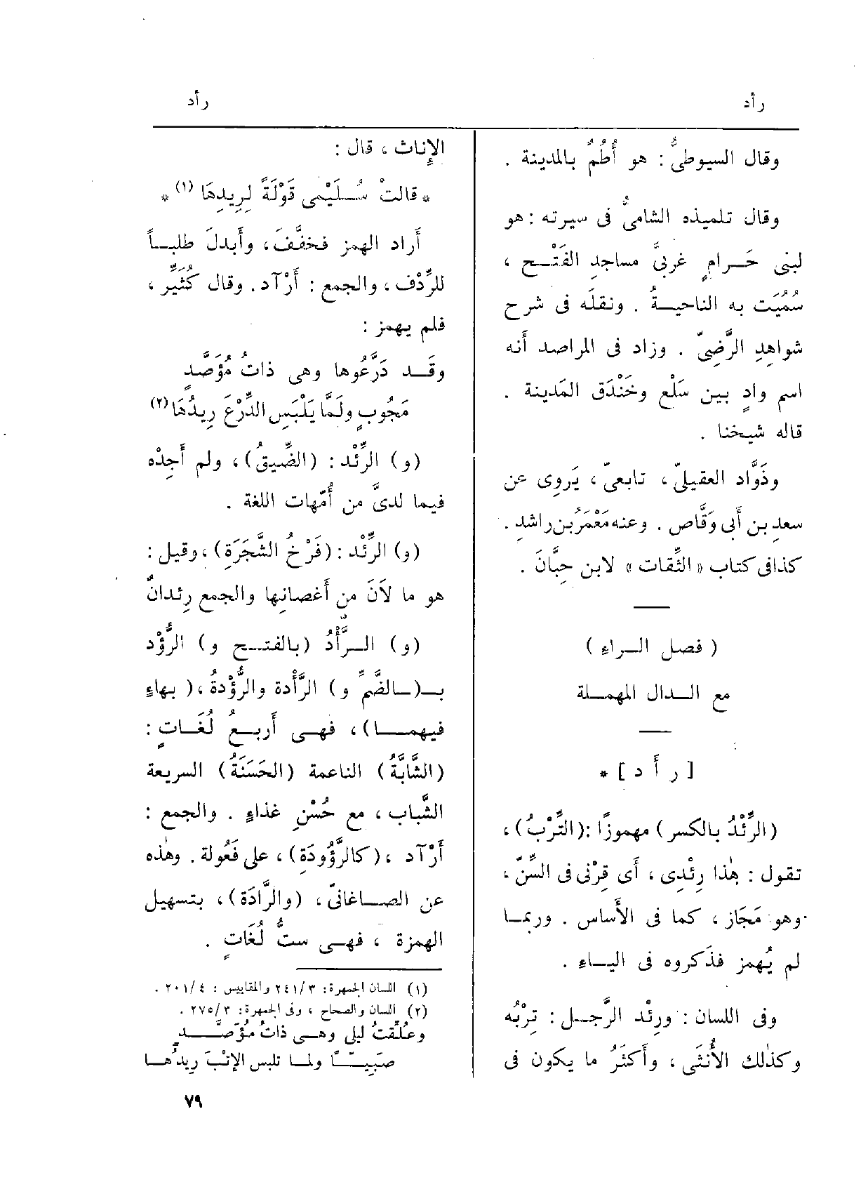 (و) الرَّأْدُ (بِالْفَتْح و) } الرُّؤْد ب (الضَّمِّ و) {الرَّأْدة} والرُّؤْدةُ، (بهاءٍ فيهمَا) ، فَهِيَ أَربعُ لُغَاتٍ: (الشَّابَّةُ) الناعمة (الحَسَنَةُ) السريعة الشَّباب، مَعَ حُسْنِ غذاءٍ. وَالْجمع: أَرْآد، ( {كالرَّؤُودَةِ) ، على فَعُولة. وهاذه عَن الصاغانيّ، (} والرَّادَة) ، بتسهيل الْهمزَة، فَهِيَ ستُّ لُغَاتٍ.