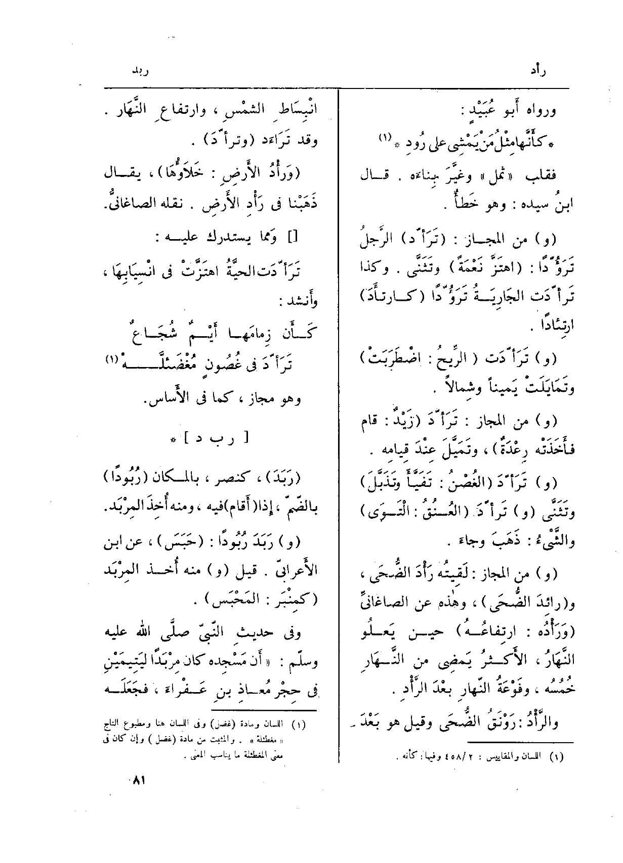 والرَّأْدُ: رَوْنَقُ الضُّحَى وَقيل هُوَ بَعْدَ انْبِسَاطِ الشمْسِ، وارتفاعِ النَّهَر. وَقد {تَرَاءَد (} وترأدَّ) .