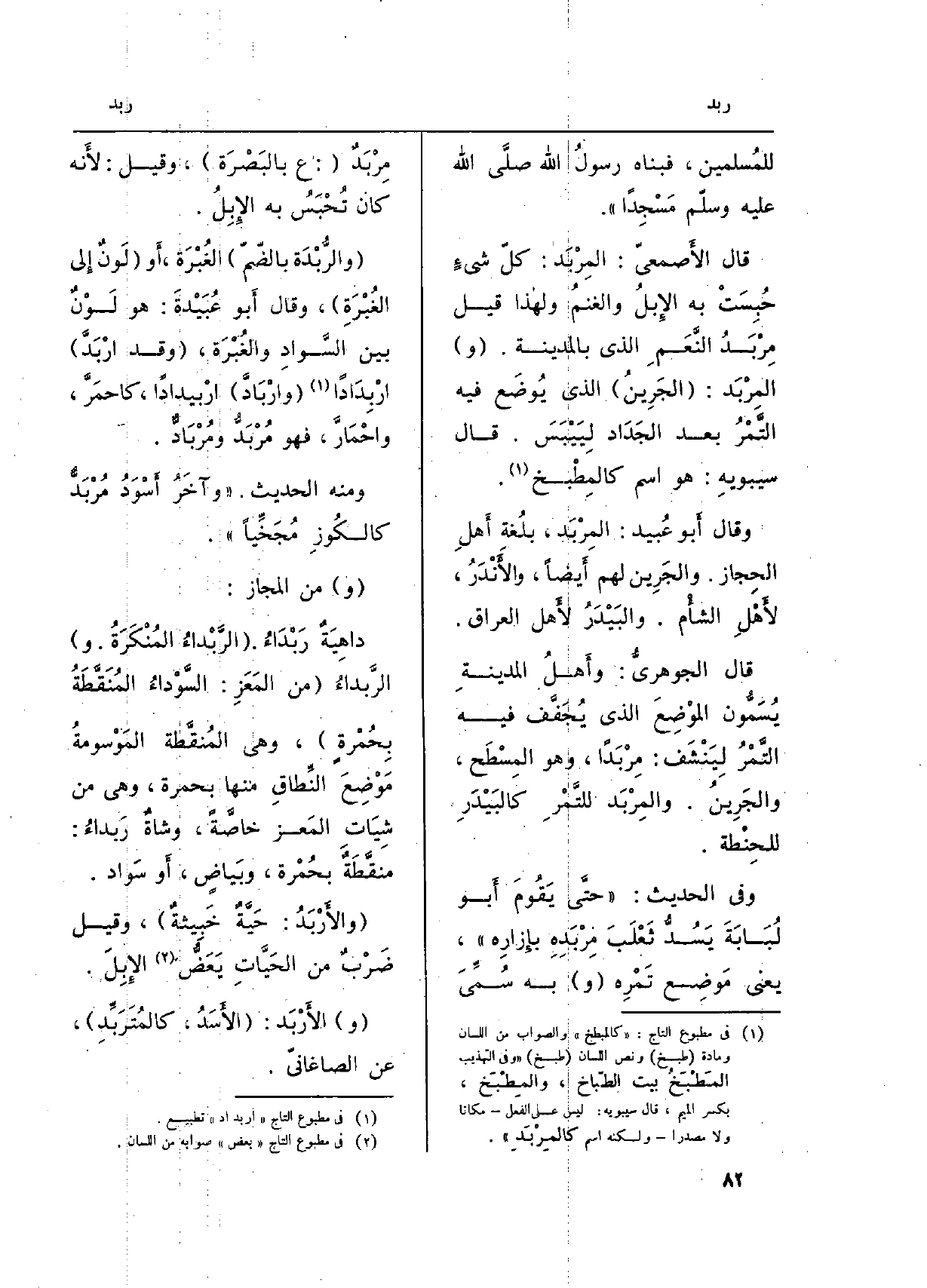 وَفِي الحَدِيث: (حتَّى يَقُومَ أَبو لُبَابَةَ يَسُدُّ ثَعْلَبَ مِرْبَدِهِ بإِزارِهِ) ، يَعْنِي مَوضِع تَمْرِه (و) بِهِ سُمِّيَ مِرْبَدٌ: (ع بالبَصْرَة) ، وَقيل: لأَنه كَانَ تُحْبَسُ بِهِ الإِبِلُ.