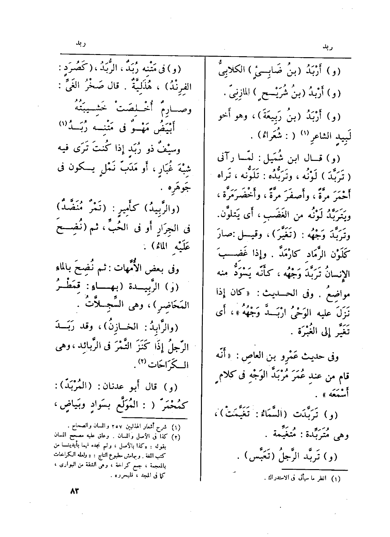 (و) قَالَ ابْن شُمَيل لمّا رَآنِي (تَرَبَّدَ) لَوْنُ، وتَرَبُّدُه: تَلَوّنه، تَراه أَحْمَرَ مرَّةً، وأَصفَرَ مرَّةً، وأَخْضَرَ مَرَّة، ويَتَرَبَّدُ لَوْنُه من الغَضَبِ، أَي يَتلوَّن. وتَرَبَّدَ وَجْهُه: (تِغيَّرَ) ، وَقيل: صارَ كَلَوْن الرَّمَادِ كارْمَدَّ. وإِذا غَضِبَ الإِنسانُ تَرَبَّدَ وَجْهُه، كأَنّه يَسوَدُّ مِنْهُ مواضِعُ. وَفِي الحَدِيث: (كَانَ إِذا نَزَلَ عَلَيْهِ الوَحْيُ ارْبَدَّ وَجْهُهُ) ، أَي تَغَيَّر إِلى الغُبْرَة.