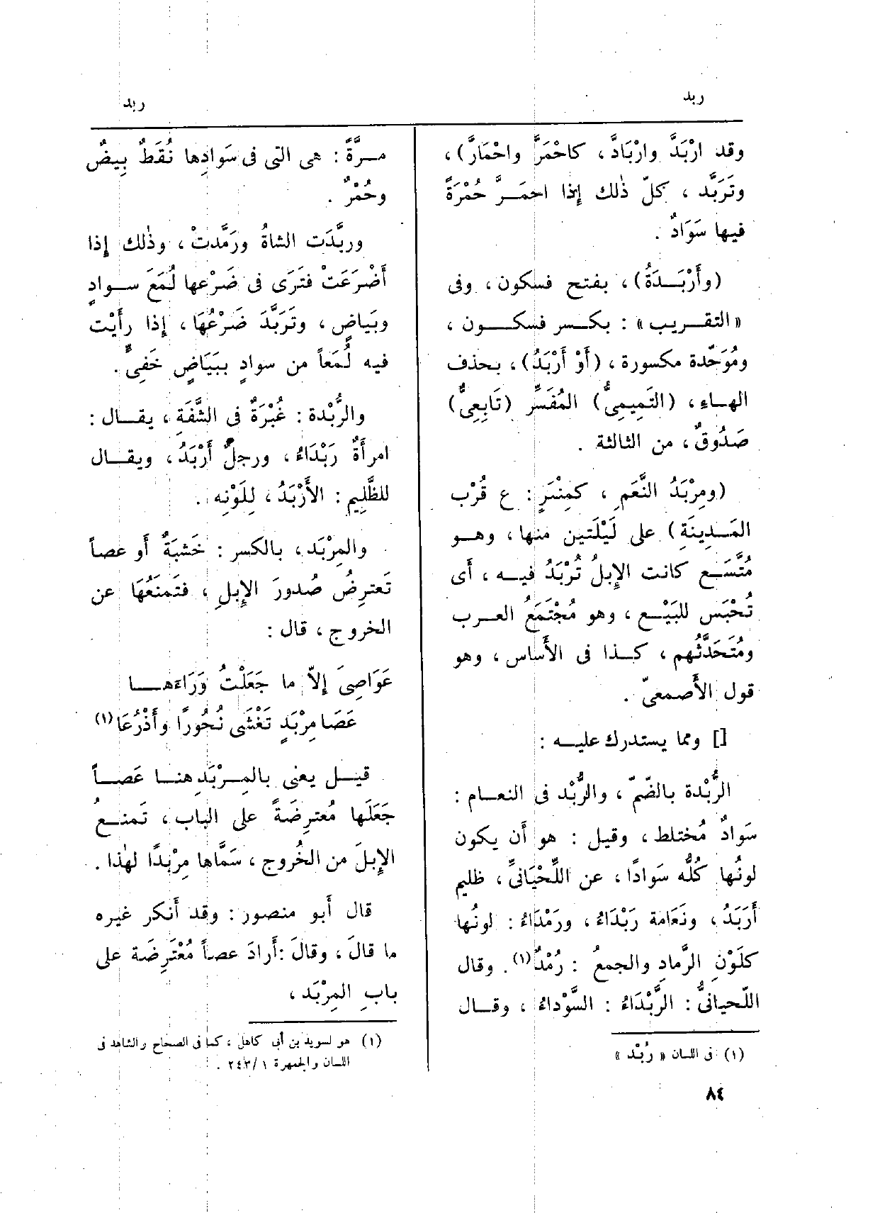 وربَّدَت الشاةُ ورَمَّدتْ، وذالك إِذا أَضْرَعَتْ فتَرَى فِي ضَرْعها لُمَعَ سوادٍ وبَياضٍ، وتَرَبَّدَ ضَرْعُهَا، إِذا رأَيْت فِيهِ لُمْعاً من سوادٍ ببَيَاضٍ خَفِيَ.
