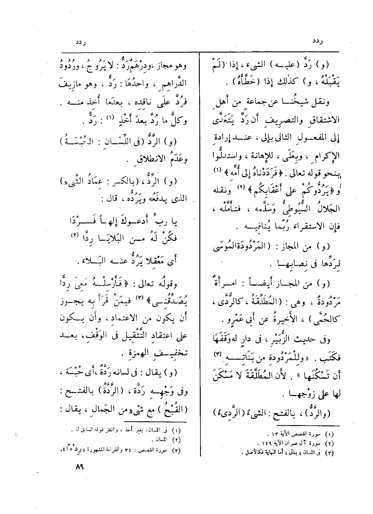 وَنقل شيخُنا عَن جماعةٍ من أَهلِ الاشتقاقِ والتصرِيفِ أَن ردَّ يَتَعَدَّى إِلى المفعولِ الثَّانِي بإِلى، عِنْد إِرادةِ الْإِكْرَام، وبِعَلَى، للإِهانة، واستدلُّوا بِنَحْوِ قَوْله تَعَالَى: {فَرَدَدْنَاهُ إِلَى أُمّهِ} (الْقَصَص: 13) و {يَرُدُّوكُمْ عَلَى أَعْقَابِكُمْ} (آل عمرَان: 149) وَنَقله الجَلالُ السُّيُوطِيُّ وَسَلَّمه، فتأَمَّله، فإِن الاستقراءَ رُبّما يُنافِيه.