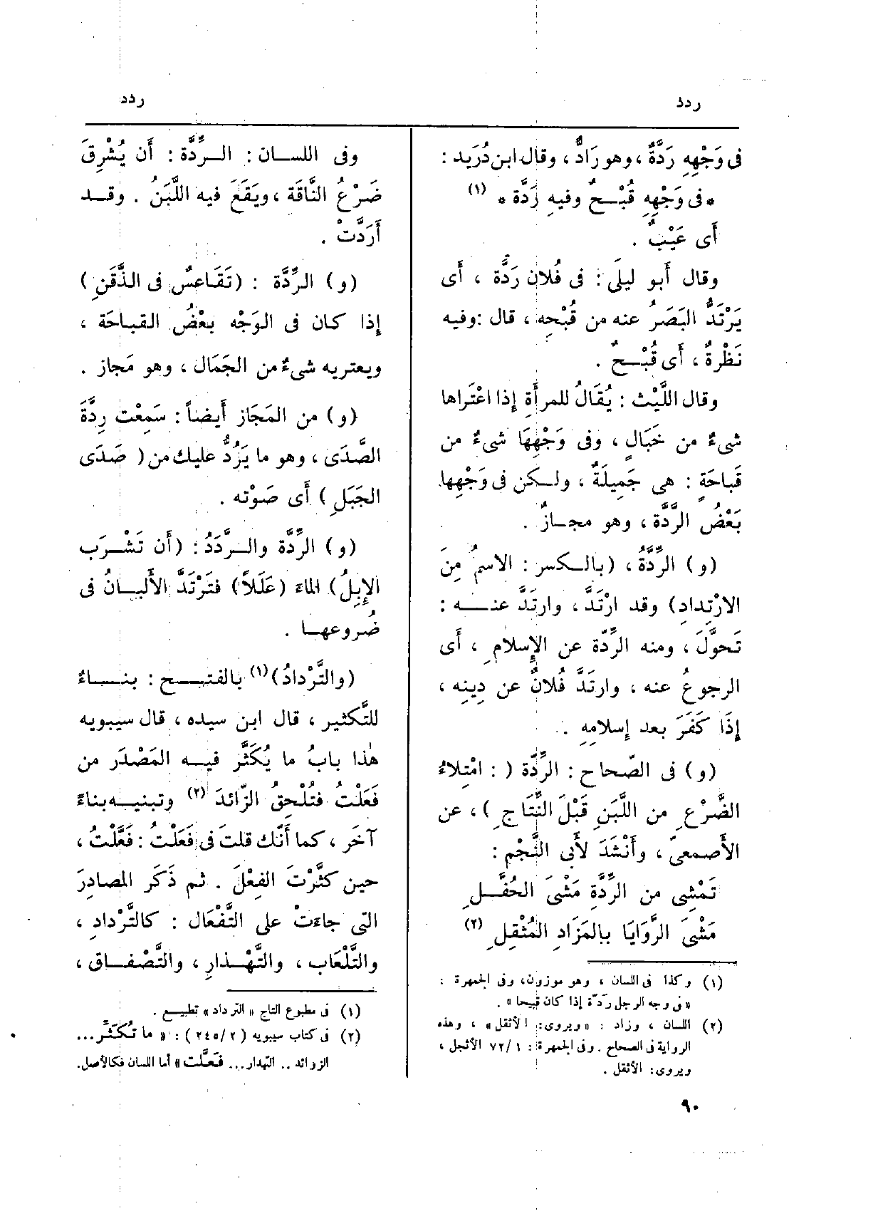 وَقَالَ اللَّيْث: يُقَالُ للمرأَةِ إِذا اعْتَراها شيءٌ من خَبَالٍ، وَفِي وَجُهِهَا شيءٌ من قَباحَةٍ: هِيَ جَمِيلَةٌ، وَلَكِن فِي وَجْهِها بَعْضُ الرَّدَّة، وَهُوَ مجازٌ.