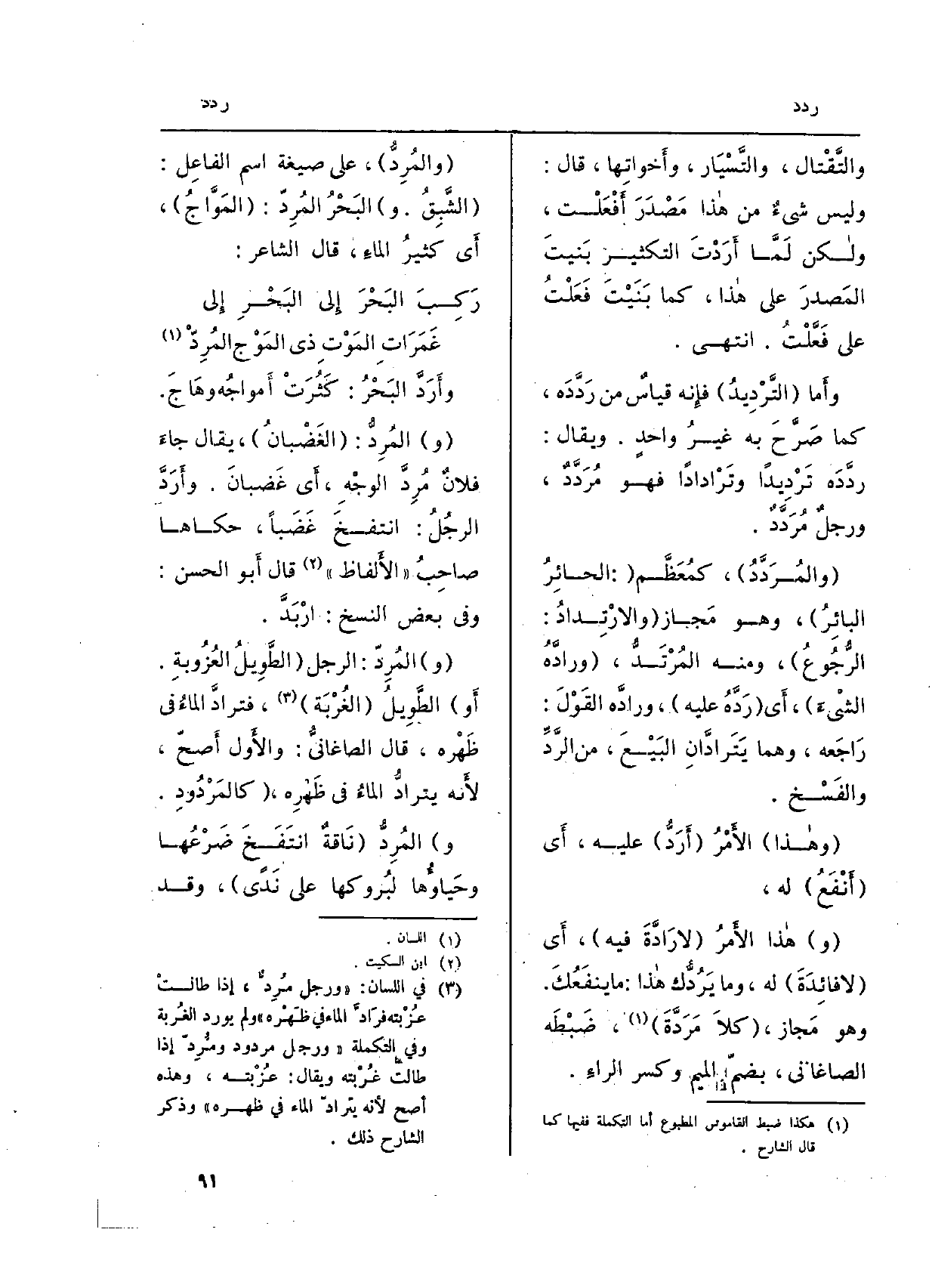 (و) المُرِدّ: الرجل (الطَّوِيلُ العُزُوبةِ. أَو) الطَّوِيلُ (الغُرْبَة) ، فترادَّ الماءُ فِي ظَهْره، قَالَ الصاغانيُّ: والأَول أَصحّ، لأَنه يترادُّ الماءُ فِي ظَهْرِه، (كالمَزْدُودِ) .
