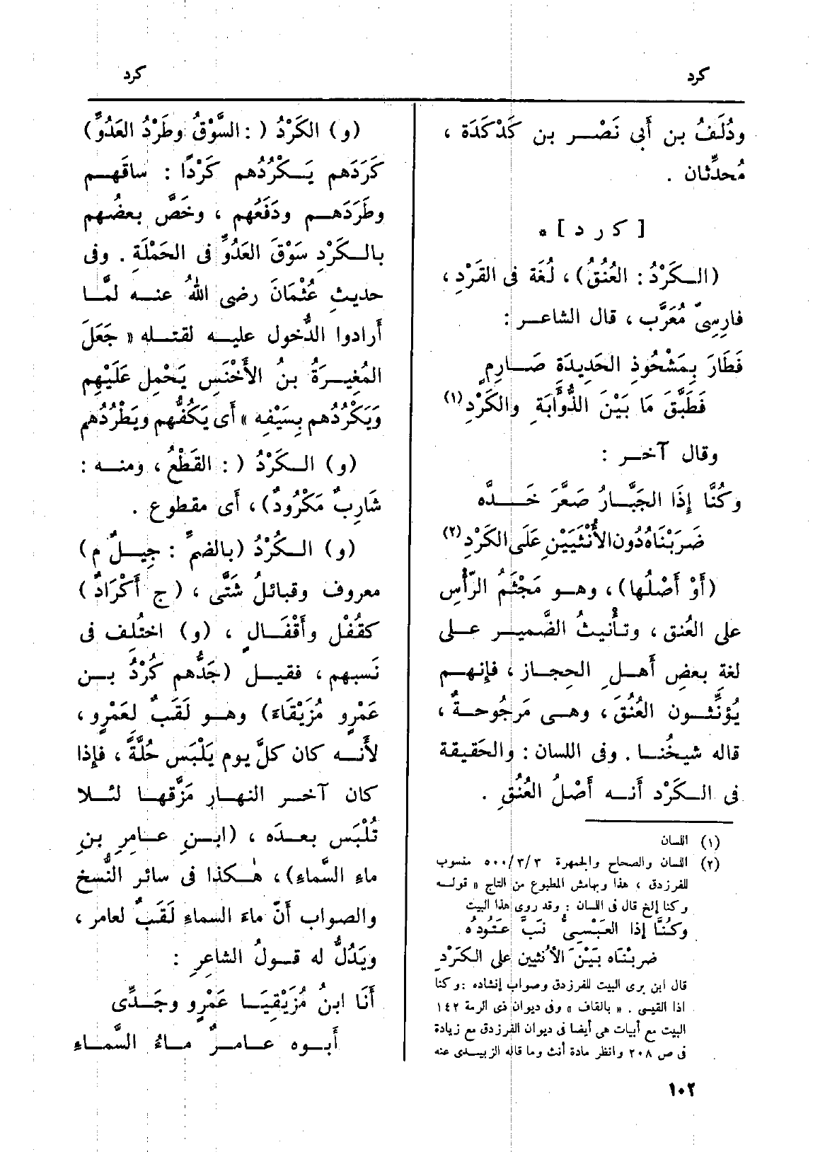 : (الكَرْدُ: العُنُقُ) ، لُغَة فِي القَرْدِ، فارِسِيّ مُعَرَّب، قَالَ الشَّاعِر: