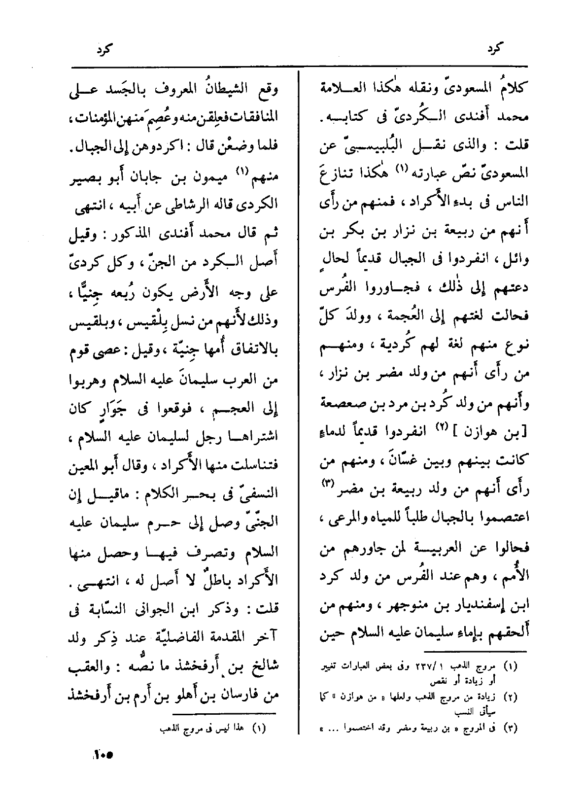 كلامُ المسعوديّ وَنَقله هاكذا الْعَلامَة مُحَمَّد أَفندي الكُرديّ فِي كِتَابه. قلت: وَالَّذِي نقل البُلبيسيّ عَن المسعوديّ نصّ عِبَارَته هاكذا تنازعَ النَّاس فِي بدءِ الأَكراد، فَمنهمْ من رأَى أَنهم من ربيعَة بن نزار بن بكر بن وَائِل، انفردوا فِي الْجبَال قَدِيما لحالٍ دعتهم إِلى ذالك، فجاوروا الفُرس فحالت لغتهم إِلى العَجمة، وولدَ كلّ نوع مِنْهُم لُغَة لَهُم كُردية، وَمِنْهُم من رأَى أَنهم من ولد مُضر بن نزار، وأَنهم من ولد كُرد بن مرد بن صعصعة (بن هوَازن) انفردوا قَدِيما لدماءٍ كَانَت بَينهم وَبَين غسّانَ، وَمِنْهُم من رأَى أَنهم من ولد ربيعَة بن مُضر اعتصموا بالجبال طلبا لمياه والمرعى، فحالوا عَن الرعبية لمن جاورهم من الأُمم، وهم عِنْد الفُرس من ولد كرد ابْن إِسفنديار بن منوجهر، وَمِنْهُم من أَلحقهم بإِماءِ سُلَيْمَان عَلَيْهِ السَّلَام حِين وَقع الشيطانُ الْمَعْرُوف بالجَسد على المنافقات فعِلقن مِنْهُ وعُصِمَ مِنْهُنَّ الْمُؤْمِنَات، فَمَال وضعْن قَالَ: اكردوهن إِلى الْجبَال. مِنْهُم مَيْمُون بن جَابَان أَبو بَصِير الكدري قَالَه الرشاطي عَن أَبهي، انْتهى. ثمَّ قَالَ مُحَمَّد أَفندي الْمَذْكُور: وَقيل أَصل الكرد من الجنّ، وكل كرديّ على وَجه الأَرض يكون رُبعهو جِنيًّا، وَذَلِكَ لأَنهم من نسل بِلْقيس، وبلقيس بالِاتِّفَاقِ أُمها جِنيّة، وَقيل: عصى قوم من الْعَرَب سليمانَ عَلَيْهِ السَّلَام وهربوا إِلى الْعَجم، فوقعوا فِي جَوَارٍ كَانَ اشْتَرَاهَا رجل لِسُلَيْمَان عَلَيْهِ السَّلَام، فتناسلت مِنْهَا الأَكراد، وَقَالَ أَبو الْمعِين النفسيّ فِي بَحر الْكَلَام: مَا قيل إِن الجنّي وصل إِلَى حرم سُلَيْمَان عَلَيْهِ السَّلَام وَتصرف فِيهَا وَحصل مِنْهَا الأَكراد باطلٌ لَا أَصل لَهُ، انْتهى. قلت: وَذكر ابْن الجواني النسّابة فِي آخر الْمُقدمَة الفاضليّة عِنْد ذِكر ولد شالخ بن أَرفخشد مَا نصُّه: والعقب من فارسان بن أَهلو بن أَرم بن أَرفخشذ