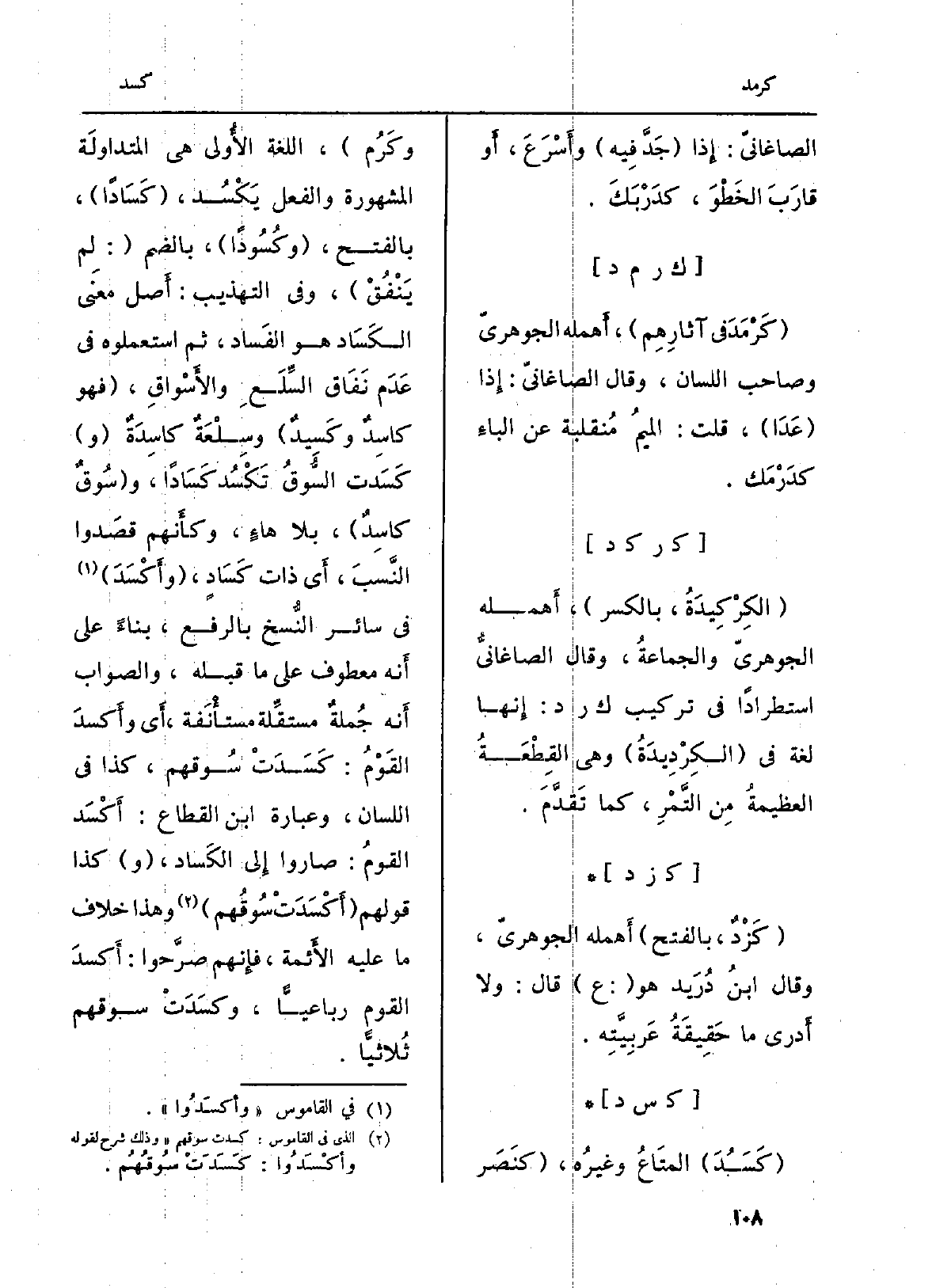 : (كَسَبُد) المتَاعُ وغيرُه، (كنَصَر وكَرُم) ، اللُّغَة الأُولى هِيَ المتداولَة الْمَشْهُورَة وَالْفِعْل يَكحسُد، (كَسَاداً) بِالْفَتْح، (وكُسُوداً) ، بِالضَّمِّ (: لم يَنْفُقْ) ، وَفِي التَّهْذِيب: أَصل معنَى الكَسَاد هُوَ الفَساد، ثمَّ استعملوه فِي عَدَم نَفَاق السِّلَعِ والأَسْواقِ، (فَهُوَ كاسِدٌ وكَسِيدٌ) وسِلْعَةٌ كاسِدَةٌ (و) كَسَدت السُّوقُ تَكحسُد كَسَاداً، و (سُوقٌ كاسِدٌ) ، بِلَا هاءه، وكأَنهم قصَدوا النَّسبَ، أَي ذَات كَسَادٍ، (وأَكْسَدَ) فِي سَائِر النُّسخ بِالرَّفْع، بِنَاء على أَنه مَعْطُوف على مَا قبله، وَالصَّوَاب أَنه جُملةٌ مستقِّلة مستأْنَفة، أَي وأَكسدَ القَوْمُ: كَسَدَتْ سُوقهم، كَذَا فِي اللِّسَان، وَعبارَة ابْن القطاع: أَكْسَد القومُ: صَارُوا إِلى الكَساد، (و) كَذَا قَوْلهم (أَكْسَدَتْ سُوقُهم) وَهَذَا خلاف مَا عَلَيْهِ الأَئمة، فإِنهم صرَّحوا: أَكسدَ الْقَوْم رباعيًّا، وكسَدَتْ سوقهم ثُلاثيًّا.