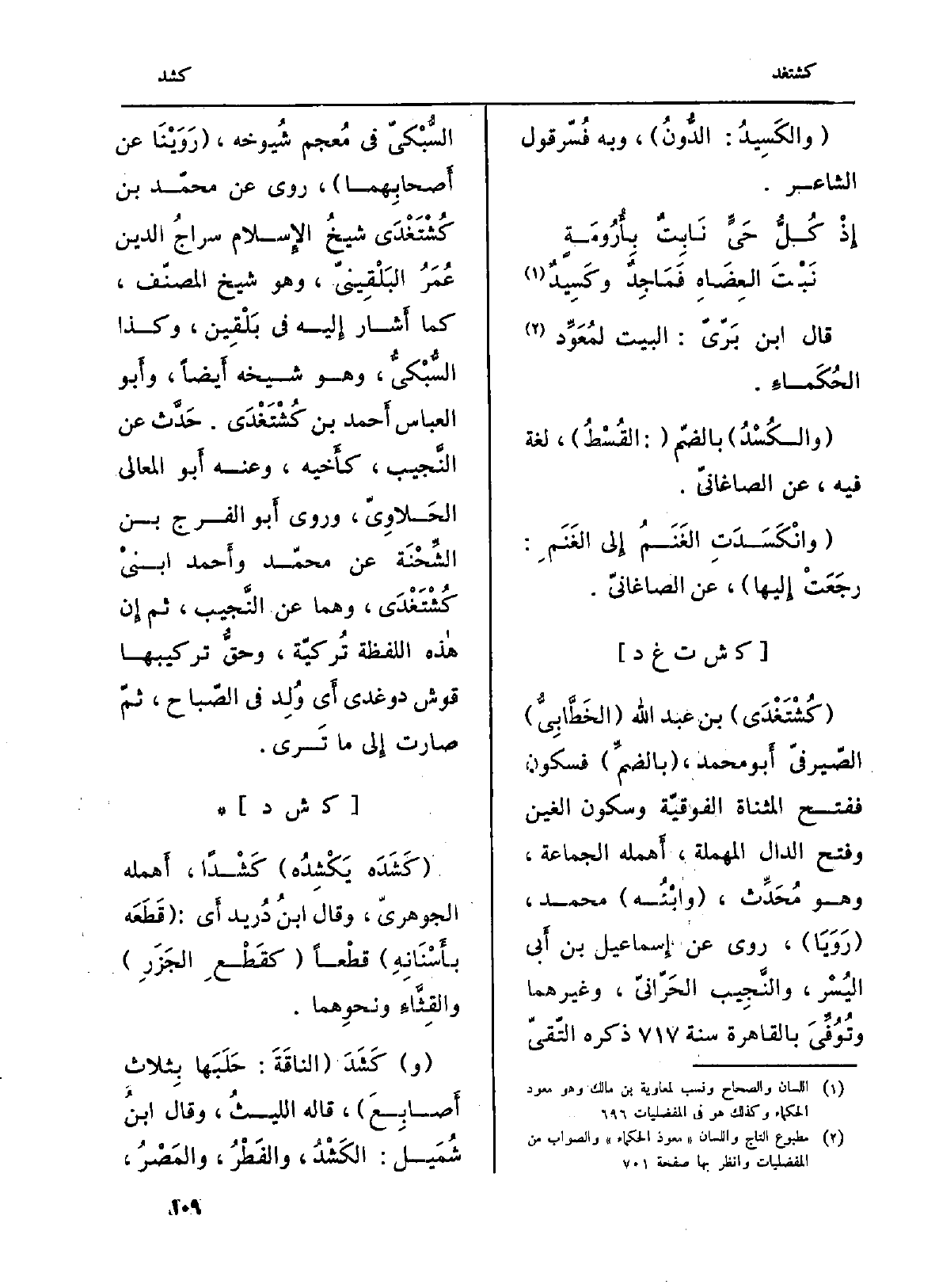: (كُشْتَغْدَى) بن عبد الله (الخَطَّابِيُّ) الصّيرفيّ أَبو مُحَمَّد، (بالضمِّ) فَسُكُون فَفتح الْمُثَنَّاة الفوقيّة وَسُكُون الْغَيْن وَفتح الدَّال الْمُهْملَة، أَهمله الْجَمَاعَة، وَهُوَ مُحَدِّث، (وابْنُه) مُحَمَّد، (رَوَيَا) ، روى عَن إِسماعيل بن أَبي اليُسْر، والنَّجِيب الحَرّانيّ، وَغَيرهمَا وتُوُفِّيَ بِالْقَاهِرَةِ سنة 717 ذكره التّقى السُّبْكيّ فِي مُعجم شُيوخه، (رَوَيْنَا عَن أَصحابِهما) ، روى عَن محمّد بن كُشْتَغْدَى شيخُ الإِسلام سراجُ الدّين عُمَرُ البَلْقِينيّ، وَهُوَ شيخ المصنّف، كَمَا أَشار إِلَيْهِ فِي بَلْقِين، وَكَذَا السُّبْكيُّ، وَهُوَ شَيْخه أَيضاً، وأَبو الْعَبَّاس أَحْمد بن كُشْتَغْدَى. حَدَّث عَن النَّجيب، كأَخيه، وَعنهُ أَبو الْمَعَالِي الحَلاوِيّ، وروى أَبو الْفرج بن الشِّحْنَة عَن محمّد وأَحمد ابنيْ كُشْتَغْدَى، وهما عَن النَّجيب، ثمَّ إِن هاذه اللَّفْظَة تُركيّة، وحقُّ تركيبها قوش دوغدي أَي وُلِد فِي الصّباح، ثمّ صَارَت إِلى مَا تَرى.