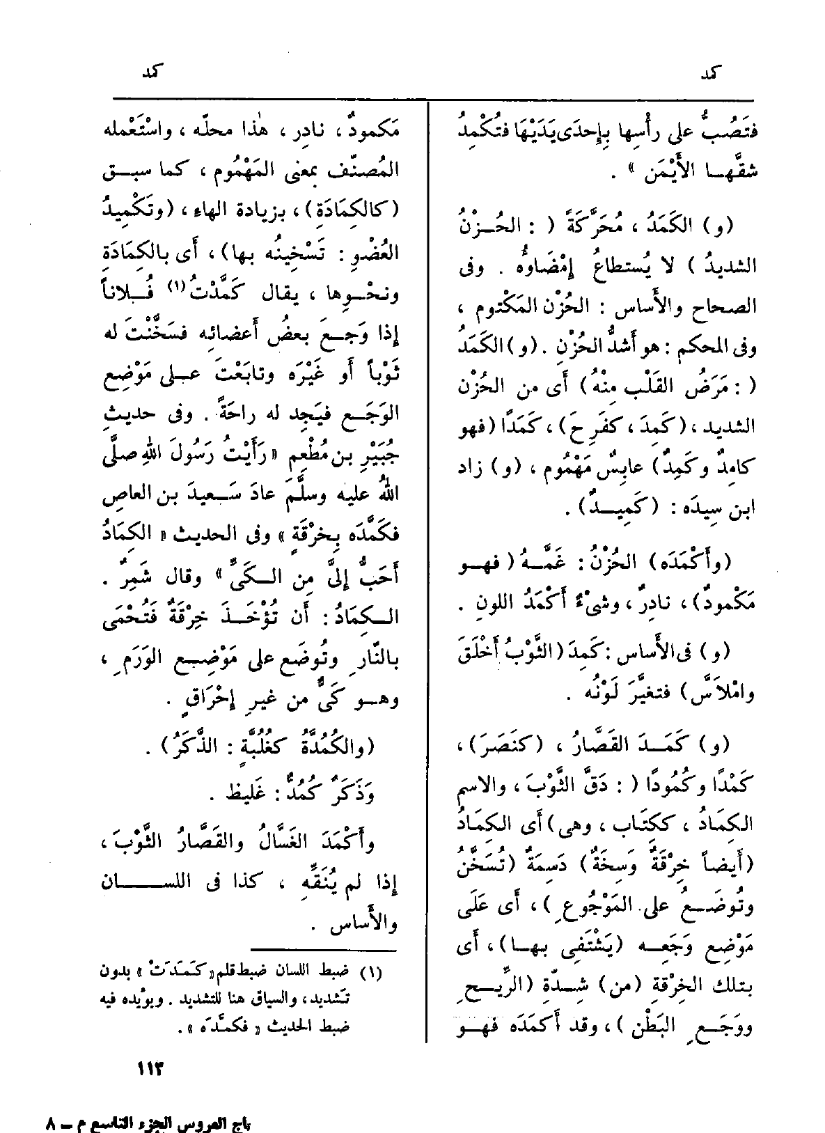 (و) كَمَدَ القَصَّارُ، (كَنَصَرَ) ، كَمْداً وكُمُوداً (: دَقَّ الثَّوْبَ، وَالِاسْم الكِمَادُ، ككِتَاب، وَهِي) أَي الكِمَادُ (أَيضاً خِرْقَةٌ وَسخَةٌ) دَسِمَةٌ (تُسَخَّنُ وتُوضَعُ على المَوْجُوعِ) ، أَي عَلَى مَوْضع وَجَعِه (يَشْتَفِي بهَا) ، أَي بِتِلْكَ الخِرْقَةِ (من) شِدّةِ (الرِّيحِ ووَجَع البَطْن) ، وَقد أَكمَدَه فَهُوَ مَكمودٌ، نادرِ، هاذا محلّه، واسْتَعْمله المُصنّف بِمَعْنى المَهْمُوم، كَمَا سبق (كالكمَادَةِ) ، بِزِيَادَة الهاءِ، (وتَكْمِيدُ العُضْوِ: تَسْخِينُه بهَا) ، أَي بالكِمَادَةِ ونحْوِها، يُقَال كَمَّدْتُ فُلاناً إِذا وَجعَ بعضُ أَعضائِه فسَخَّنْتَ لَهُ ثَوْباً أَو غَيْرَه وتابَعْتَ على مَوْضع الوَجَع فيَجِد لَهُ راحَةً. وَفِي حديثِ جُبَيْرِ بن مُطْعِم (رَأَيْتُ رَسُولَ الله صلى الله عَلَيْهِ وسلمعادَ سَعيدَ بن العاصِ فكَمَّدَه بِخرْقَةٍ) وَفِي الحَدِيث (الكِمَادُ أَحَبُّ إِليَّ مِن الكَيِّ) وَقَالَ شَمِرٌ. الكِمَادُ: أَن تُؤْخَذَ خِرْقَةٌ فَتُحْمَى بالنّارِ وتُوضَع على مَوْضِع الوَرَمِ، وَهُوَ كَيٌّ من غيرِ إِحْرَاقٍ.