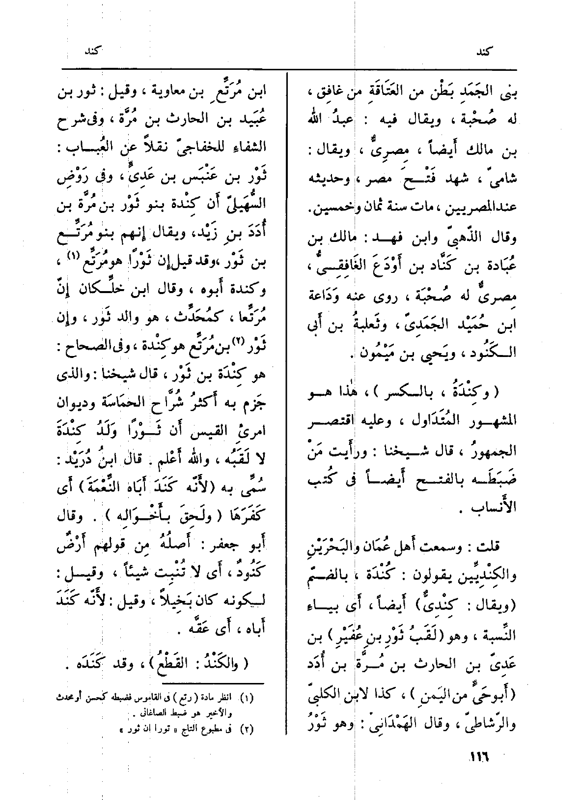 قلت: وَسمعت أَهل عُمَان والبَحْرَيْنِ والكِنْدِيِّين يَقُولُونَ: كُنْدَة، بالضمّ (وَيُقَال: كِنْدِيٌّ) أَيضاً، أَي بياءِ النِّسبة، وَهُوَ (لَقَبُ ثَوْره بنِ عُفَيْرِ) بن عَدِيّ بن الْحَارِث بن مُرَّة بن أُدَد (أَبو حَيَ من اليَمنِ) ، كَذَا لِابْنِ الكلبيّ والرّشاطيّ، وَقَالَ الهَمْدَانِيّ: وَهُوَ ثَوْرُ ابْن مُرَتِّعِ بن مُعَاوِيَة، وَقيل: ثَوْر بن عُبَيد بن الْحَارِث بن مُرَّة، وَفِي شرح الشفاءِ للخفاجيّ نقلا عَن العُباب: ثَوْر بن عَنْبَس بن عَدِيَ، وَفِي رَوْضِ السُّهَيليّ أَن كِنْدة بَنو ثَوْر بن مُرَّة بن أُدَدَ بن زَيْد، وَيُقَال إِنهم بَنو مُرَتِّع بن ثَوْر، وَقد قيل إِن ثَوْراً هُوَ مُرَتِّع، وَكِنْدَة أَبوه، وَقَالَ ابْن خلِّكان إِنّ مُرَتِّعاف، كمُحَدِّث، هُوَ وَالِد ثَور، وإِن ثَوْر بن مُرَتِّع هُوَ كِنْدة، وَفِي الصِّحَاح: هُوَ كِنْدَة بن ثَوْر، قَالَ شَيخنَا: وَالَّذِي جَزم بِهِ أَكثرُ شُرَّاح الحمَاسَة وديوان امرىءِ الْقَيْس أَن ثَوْراً وَلَدُ كِنْدَةَ لَا لَقَبُه، وَالله أَعْلم. قَالَ ابنُ دُرَيْد: سُمِّي بِهِ (لأَنّه كَنَدَ أَبَاه النِّعْمَةَ) أَي كَفَرَها (ولَحِقَ بأَخْوَالِه) . وَقَالَ أَبو جَعْفَر: أَصلُهُ من قَوْلهم أَرْضٌ كَنُودٌ، أَي لَا تُنْبِت شَيْئا، وَقيل: لكَونه كَانَ بَخِيلاً، وَقيل: لأَنّه كَنَدَ أَباه، ايي عَقَّه.