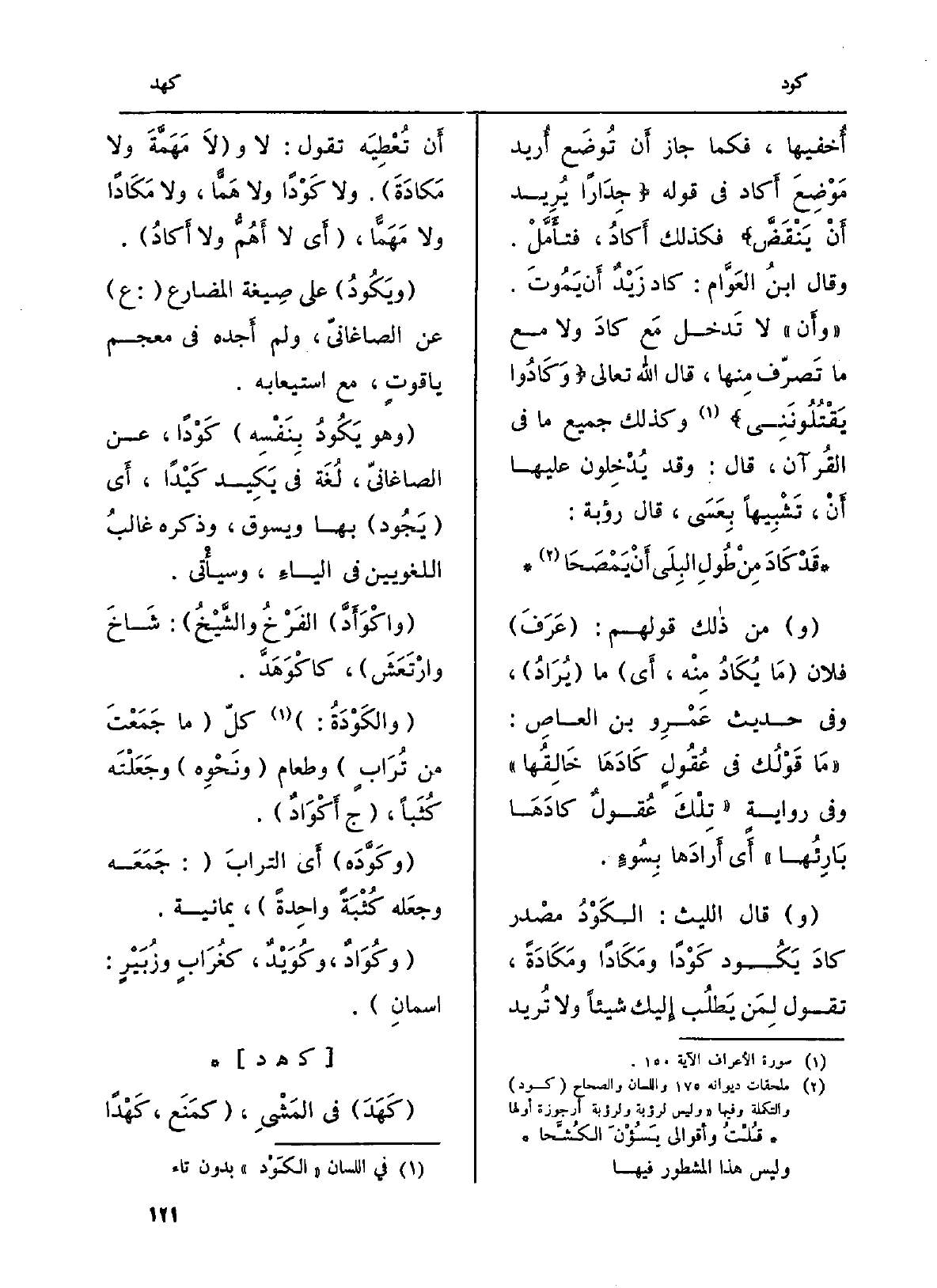 أُخفيها، فَكَمَا جَازَ أَن تُوضَع أُريد مَوْضِعَ أَكاد فِي قَوْله: {جِدَاراً يُرِيدُ أَن يَنقَضَّ} فَكَذَلِك أَكادُ، فتأَمَّلْ. وَقَالَ ابنُ العَوَّام: كَاد زَيْدٌ أَن يَمُوتَ. (وأَن) لَا تَدخل مَع كادَ وَلَا مَعَ مَا تَصرّف مِنها، قَالَ الله تَعَالَى: { {وَكَادُواْ يَقْتُلُونَنِى} (سُورَة الْأَعْرَاف، الْآيَة: 150) وَكَذَلِكَ جَمِيع مَا فِي القُرآن، قَالَ: وَقد يُدْخِلون عَلَيْهَا أَنْ، تَشْبِيهاً بِعَسَى، قَالَ رؤبة: