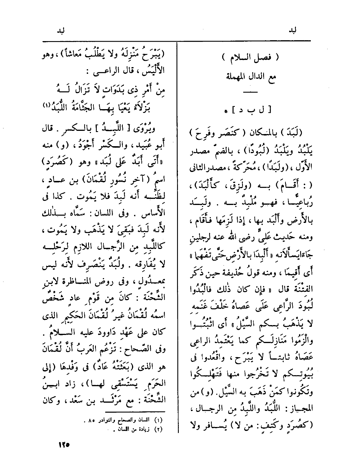 : (لَبَدَ) بِالْمَكَانِ (كنَصَر وفَرِحَ) يَلْبُدُ ويَلْبَدُ (لُبُوداً) ، بالضمّ مصدر الأَوّل، (ولَبَداً) ، مُحَرّكةً، مصدر الثَّانِي (: أَقَامَ) بِهِ (ولَزِقَ، كأَلْبَدَ) ، رُباعِيًّا، فَهُوَ مُلْبِدٌ بِهِ. ولَبِدَ بالأَرض وأَلْبَد بهَا، إِذا لَزِمَها فأَقَام، وَمِنْه حَديث عَلِيت رَضِي الله عَنهُ لرجلينِ جَاءَ يَسأَلاَنهِ (أَلْبِدَا بالأَرْضِ حَتَّى تَفْهَما) أَي أَقِيمَا، وَمِنْه قولُ حُذيفة حِين ذَكَر الفِتْنَة قَالَ (فَابْن كَانَ ذالك الْبُدُوا لُبُودَ الرَّاعِي عَلَى عَصاهُ خَلْفَ غَنَمِهِ لَا يَذْهَبُ بكم السَّيْلُ) أَي اثْبُتُوا والْزَمُوا مَنَازِلَكم كَمَا يَعْتَمِدُ الراعِي عَصَاهُ ثَابتا لَا يَبْرَح، واقْعُدوا فِي بُيُوتِكم لَا تَخْرُجوا مِنْهَا قَتَهْلِكُوا وتَكُونوا كمَنْ ذَهَبَ بِهِ السَّيْل. (و) من الْمجَاز: اللُّبَدُ واللَّبِدُ مِن الرِّجَال، (كصُرَدٍ وكَتِفٍ: من لَا) يُسافر وَلَا (يَبْرَحُ مَنْزِلَهُ وَلَا يَطْلُبُ مَعاشاً) ، وَهُوَ الأَلْيَسُ، قَالَ الرَّاعِي: