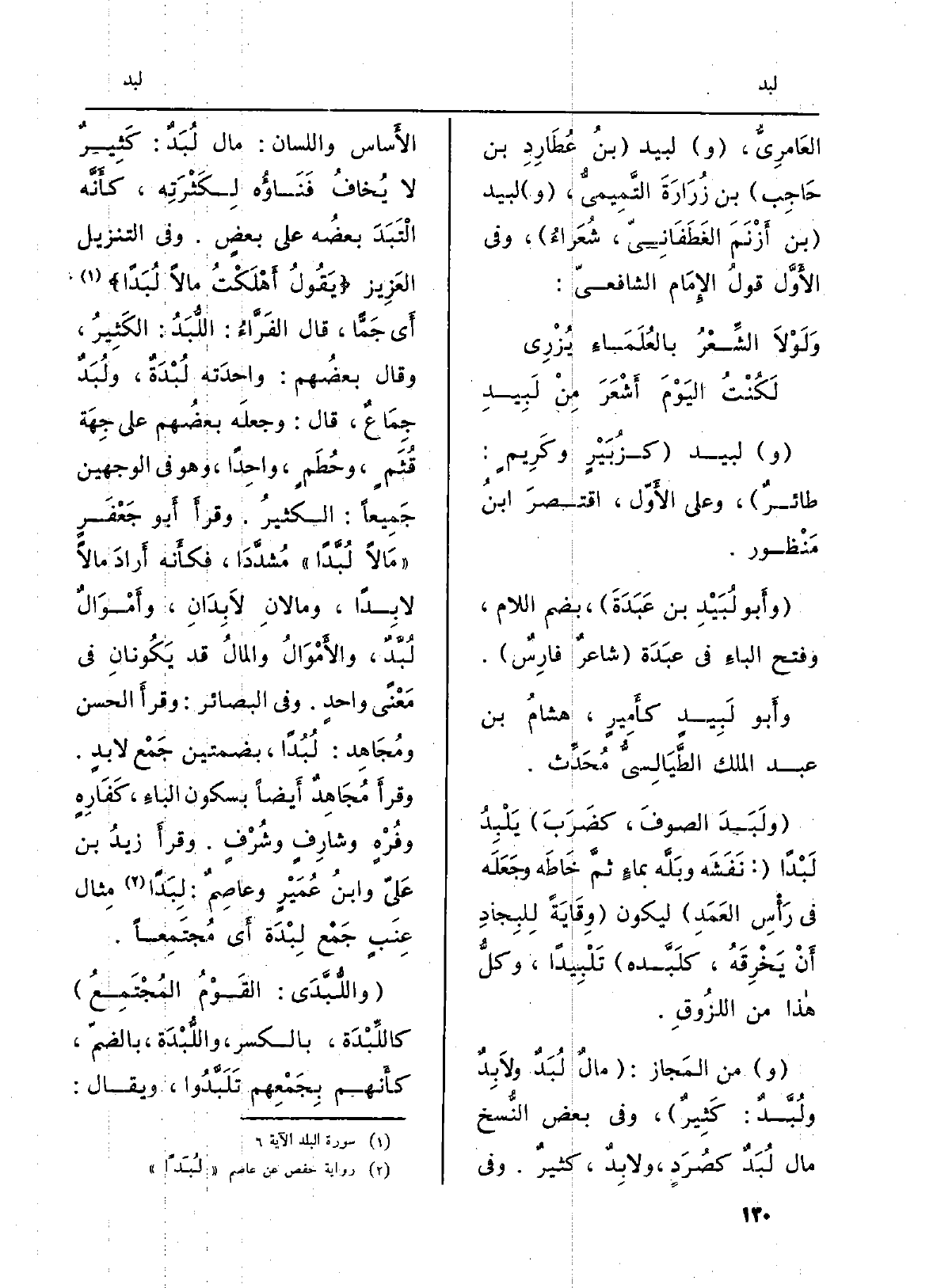 (و) من المَجاز: (مالٌ لُبَدٌ ولاَ بِدٌ ولُبَّدٌ: كَثِيرٌ) ، وَفِي بعض النُّسخ مَال لُبَدٌ كصُرَدٍ، وَلَا بِدٌ، كثيرٌ. وَفِي الأَساس وَاللِّسَان: مَال لُبَدٌ: كَثِيرٌ لَا يُخافُ فَنَاؤُ لِكَثْرَتِه، كأَنَّه الْتَبَدَ بعضُه على بعضٍ. وَفِي التَّنْزِيل العَزِيز: {يَقُولُ أَهْلَكْتُ مَالاً لُّبَداً} (سُورَة الْبَلَد، الْآيَة: 6) أَي جَمًّا، قَالَ الفَرَّاءُ: اللُّبَدُ: الكَثِيرُ، وَقَالَ بعضُهم: واحدَته لُبْدَةٌ، ولُبَدٌ جِمَاعٌ، قَالَ: وجعلَه بعضُهم على جِهَة قُثَمٍ، وحُطَمٍ، واحِداً، وَهُوَ فِي الْوَجْهَيْنِ جَمِيعاً: الكثيرُ. وقرأَ أَبو جَعْفَرٍ (مَالاً لُبَّداً) مُشدَّدَا، فكأَنه أَرادَ مَالا لَا بِداً، ومالانِ لاَبِدَانِ، وأَمْوَالٌ لُبَّدٌ، والأَمْوَالُ والمالُ قد يَكُونانِ فِي مَعْنًى واحدٍ. وَفِي البصائر: وقرأَ الْحسن ومُجَاهِد: لُبُداً، بِضَمَّتَيْنِ جَمْع لابدٍ. وقرأَ مُجَاهِدٌ أَيضاً بِسُكُون الباءِ، كَفَارِهٍ وفُرْهٍ وشارِفٍ وشُرْفٍ. وقرأَ زيدُ بن عَليّ وابنُ عُمَيْرٍ وعاصِمٌ: لِبَداً مِثال عَنِبٍ جَمْع لِبْدَة أَي مُجتَمِعاً.
