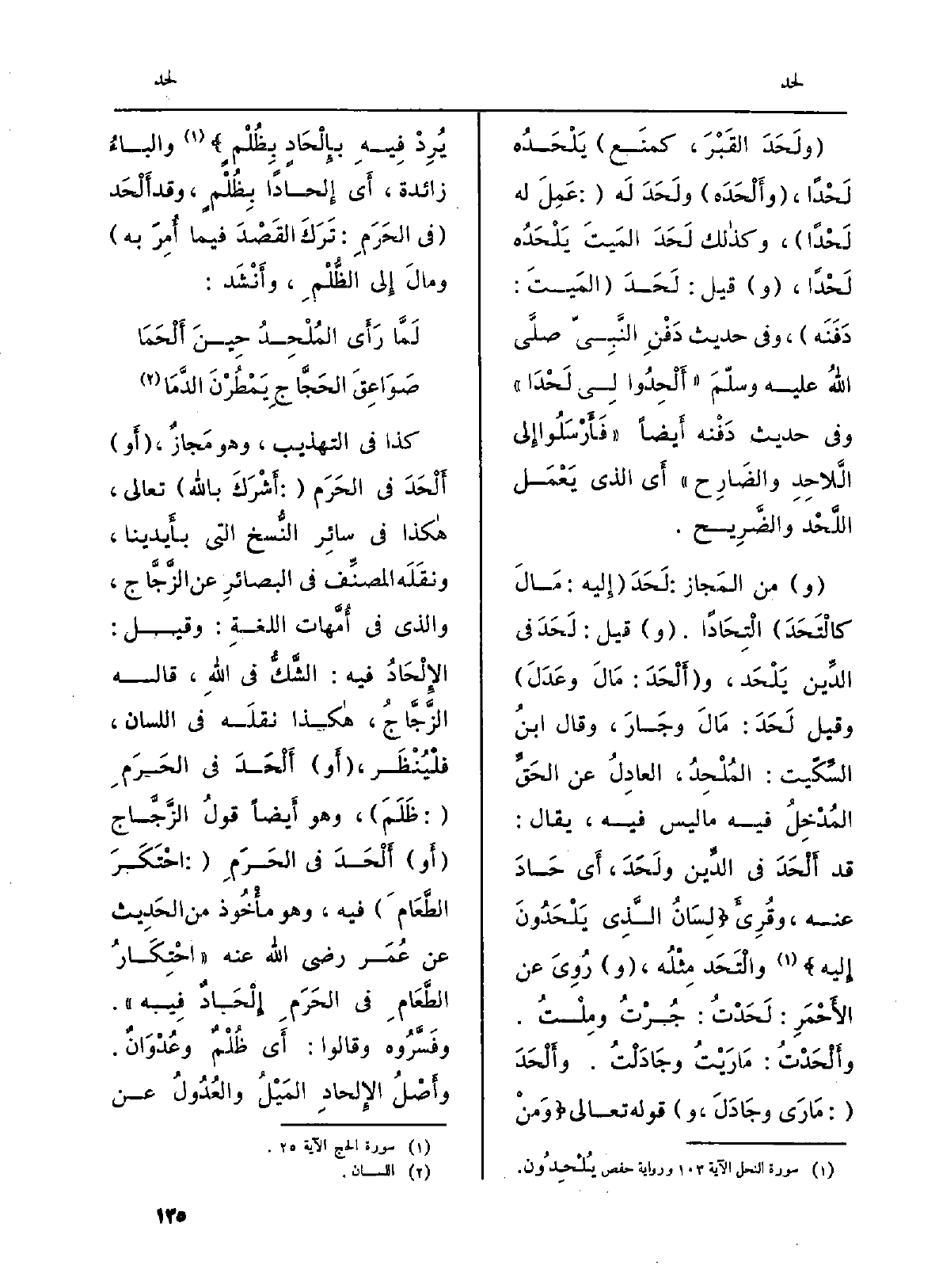 تَابع كتاب (و) من المَجاز: لَحَدَ (إِليه: مَالَ كالْتَحَدَ) الْتِحَاداً. (و) قيل: لَحَدَ فِي الدِّين يَلْحَد، و (أَلْحَدَ: مَالَ وعَدَلَ) وَقيل لَحَدَ: مَالَ وجَارَ، وَقَالَ ابنُ السِّكّيت: المُلْحِدُ، العادِلُ عَن الحَقِّ المُدْخِلُ فِيهِ مَا لَيْسَ فِيهِ، يُقَال: قد أَلْحَدَ فِي الدِّين ولَحَدَ، أَي حَادَ عَنهُ، وقُرِىءَ {لّسَانُ الَّذِى يُلْحِدُونَ إِلَيْهِ} (سُورَة النَّحْل، الْآيَة: 103) والْتَحَد مِثْلُه، (و) رُوِيَ عَن الأَحْمَرِ: لَحَدْتُ: جُرْتُ ومِلْتُ. وأَلْحَدْتُ: مَا رَيْتُ وجَادَلْتُ. وأَلْحَدَ (: مَارعى وجَادَلَ، و) قَوْله تَعَالَى: {وَمَن يُرِدْ فِيهِ بِإِلْحَادٍ بِظُلْمٍ} (سُورَة الْحَج، الْآيَة: 25) والباءُ زَائِدَة، أَي إِلحاداً بِظُلْمٍ، وَقد أَلْحَد (فِي الحَرَمِ: تَرَكَ القَصْدَ فِيمَا أُمِرَ بِهِ) ومالَ إِلى الظُّلْمِ، وأَنْشَد: