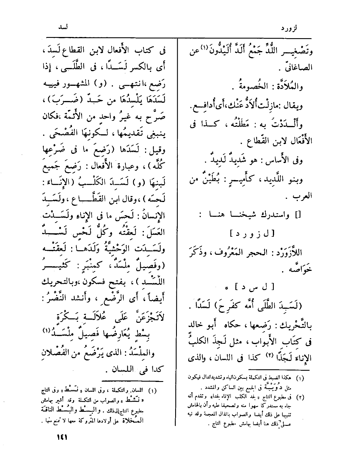 : (لَسِدَ الطَّلَي أُمَّه كفَرِحَ) لَسَداً. بالتَّحْريك: رَضِعها، حَكَاهُ أَبو خالدٍ فِي كِتَابِ الأَبواب، مثل لَجِذَ الكلبُ الإِناءَ لَجَذاً كَذَا فِي اللِّسَان، وَالَّذِي فِي كتاب الأَفعال لِابْنِ القطاع لَسِدَ، أَي بِالْكَسْرِ لَسَداً، فِي الطَّلَى، إِذا رَضِع، انْتهى. (و) الْمَشْهُور فِيهِ لَسَدَهَا يَلْسِدُهَا من حَدْ (ضَرَبَ) ، صَرَّح بِهِ غيرُ واحدٍ من الأَئمّة، فَكَانَ ينبغِي تَقديمُها، لكونِهَا الفُصْحَى. وَقيل: لَسَدَها (رَضِعَ مَا فِي ضَرْعِها كُلَّه) ، وَعبارَة الأَفعال: رَضِعَ جَميعَ لَبنِهَا (و) لَسَدَ الكَلْبُ (الإِنَاءَ: لَحِسَه) ، وَقَالَ ابْن القَطَّاع، ولَسَدَ الإِنسانُ: لَحِسَ مَا فِي الإِناءِ ولَسَدْت العَسَلَ: لَعِقْتُه وكُلُّ لَحْسٍ لَسْدٌ ولَسَدَت الوَحْشِيَّةُ وَلَدَها: لَعِقَتْه (وفَصِيلٌ مِلْسَدٌ، كمنْبَرٍ: كَثيرُ اللَّسدِ) ، بِفَتْح فَسُكُون، وبالتحريك أَيضاً، أَي الرَّضْعِ، وأَنشد النِّضْرُ:
