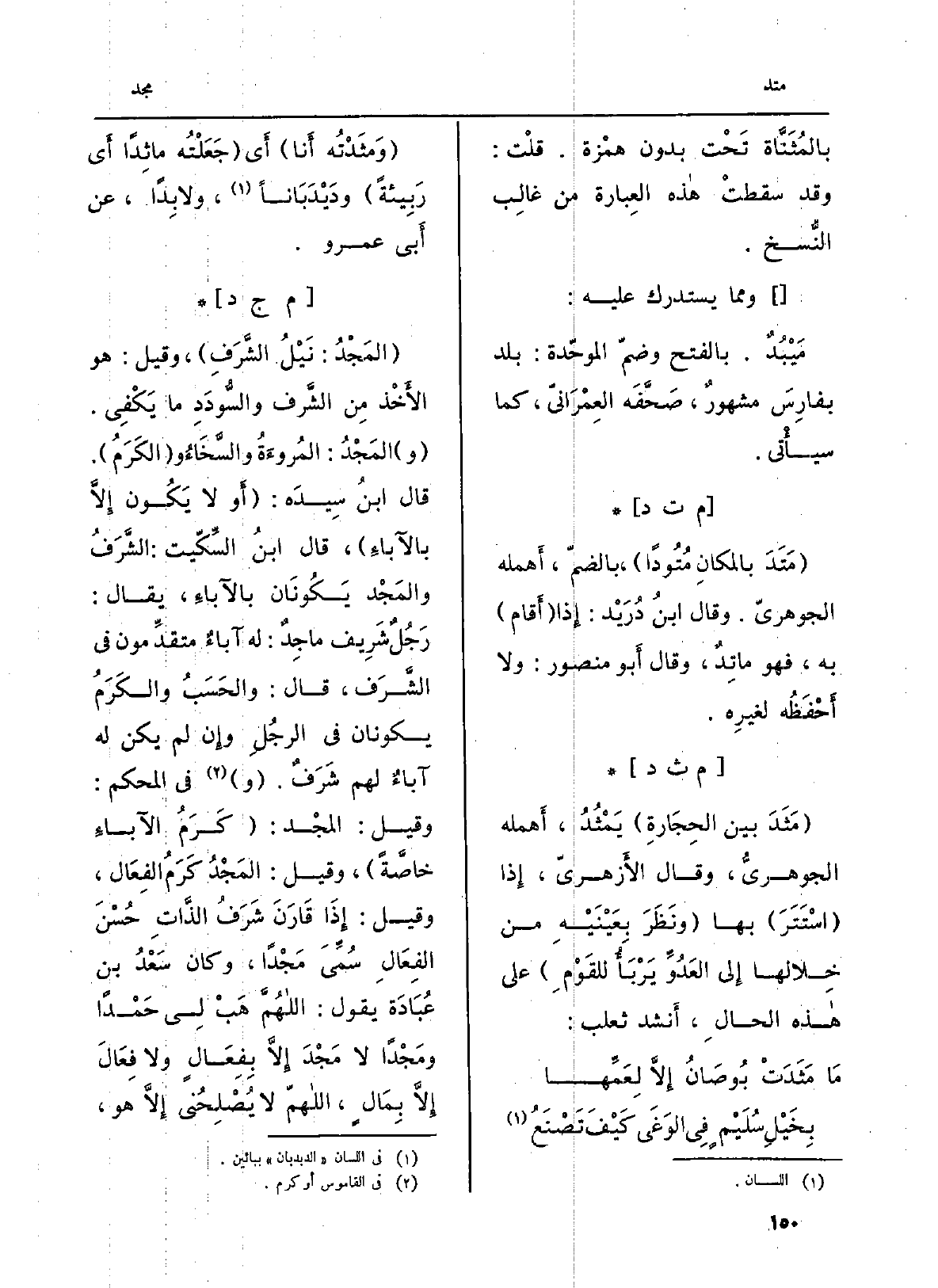 : (المَجْدُ: نَيْلُ الشَّرَفِ) ، وَقيل: هُوَ الأَخْذ مِن الشَّرف والسُّودَدِ مَا يَكْفِي. (و) المَجْدُ: المُروءَةُ والسَّخَاءُ و (الكَرَمُ) . قَالَ ابنُ سِيدَه: (أَو لَا يَكُون إِلاَّ بالآباءِ) ، قَالَ ابنُ السِّكّيت: الشَّرَفُ والمَجْد يَكُونَان بالآباءِ، يُقَال: رَجُلٌ شَرِيف ماجِدٌ: لَهُ آباءٌ متقدِّمون فِي الشَّرَف، قَالَ: والحَسَبُ والكَرَمُ يكونَانِ فِي الرجُلِ وإِن لم يكن لَهُ آباءٌ لَهُم شَرَفٌ. (و) فِي الْمُحكم: وَقيل: المجْد: (كَرَمُ الآباءِ خاصَّةً) ، وَقيل: المَجْدُ كَرَمُ الفِعَال، وَقيل: إِذَا قَارَنَ شَرَفُ الذَّاتِ حُسْنَ الفِعَالِ سُمِّيَ مَجْداً، وَكَانَ سَعْدُ بن عُبَادَة يَقُول: اللهُمَّ هَبْ لِي حَمْداً ومَجْداً لَا مَجْدَ إِلاَّ بِفِعَالٍ وَلَا فِعَالَ إِلاَّ بِمَالٍ، اللهمّ لَا يُصْلِحُني، إِلاَّ هُوَ،