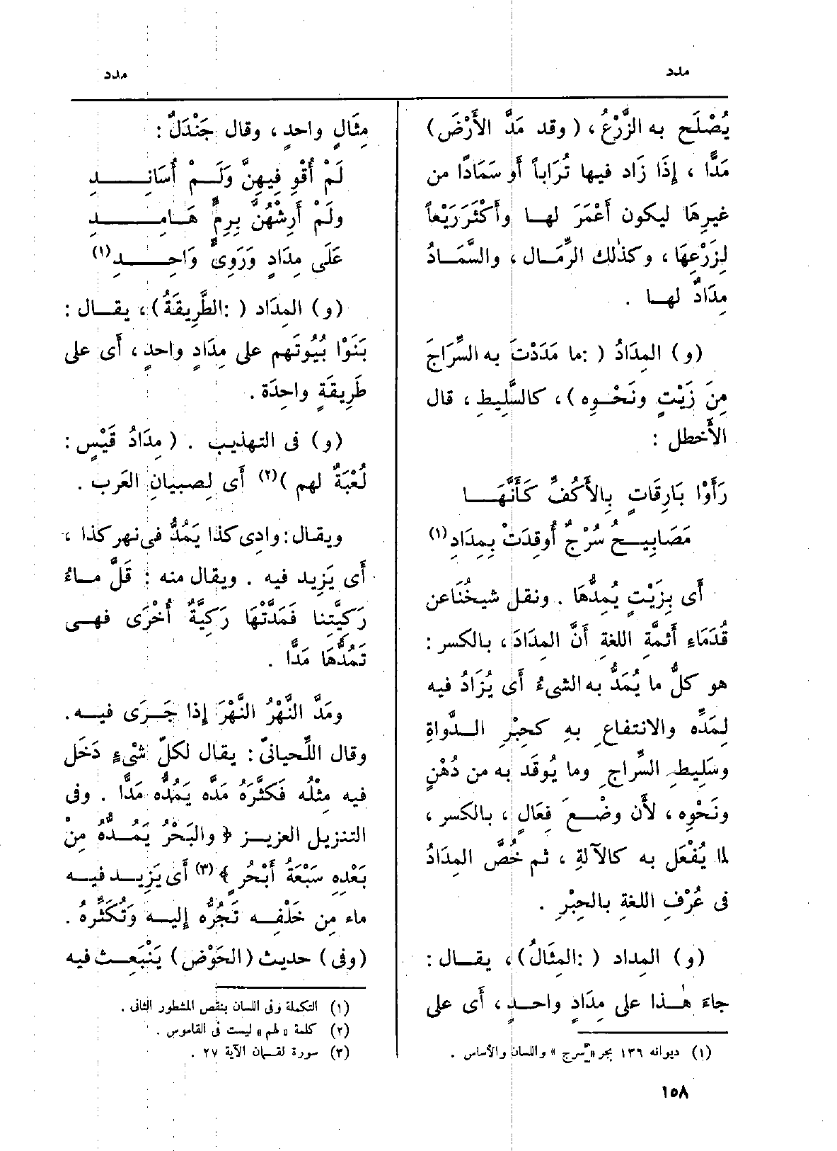 أَي بِزَيْتٍ} يُمِدُّهَا. وَنقل شيخُنَا عَن قُدَمَاءِ أَئمَّةِ اللغةِ أَنَّ {المِدَادَ، بِالْكَسْرِ: هُوَ كلُّ مَا} يُمَدُّ بِهِ الشيءُ أَي يُزَادُ فِيهِ لِمَدِّه والانتفاعِ بهِ كحِبْرِ الدَّواةِ وسَلِيطِ السِّراجِ وَمَا يُوقَد بِهِ من دُهْنٍ ونَحْوِه، لأَن وضْعَ فِعَالٍ، بِالْكَسْرِ، لما يُفْعَل بِهِ كالآلةِ، ثمَّ خُصَّ المِدَادُ فِي عُرْفِ اللغةِ بالحِبْرِ.
