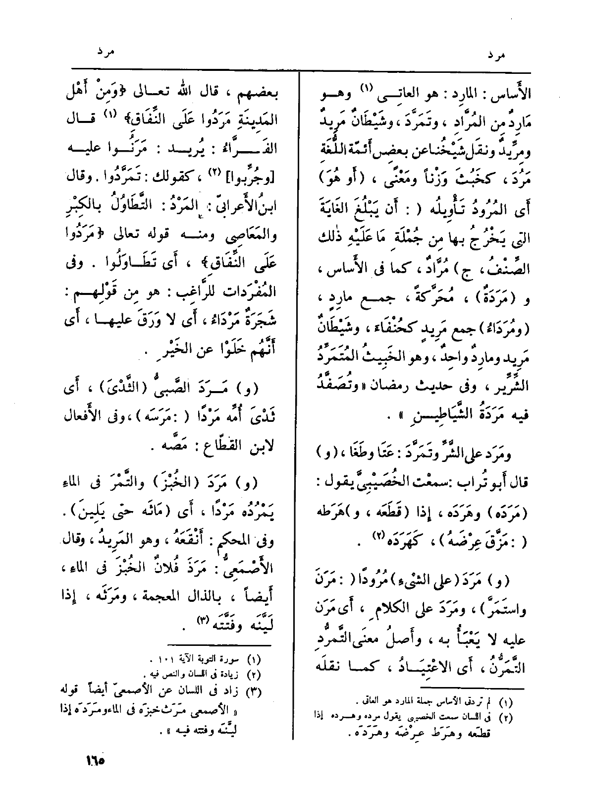 (و) مَرَدَ (على الشيْءِ) مُرُوداً (: مَرَنَ واستَمَرَّ) ، ومَرَدَ على الكلامِ، أَي مَرَن عَلَيْهِ لَا يَعْبَأُ بِهِ، وأَصلُ معنَى التَّمرُّدِ التَّمَرُّنُ، أَي الاحَتِيَادُ، كَمَا نقلَه بَعضهم، قَالَ الله تَعَالَى: {وَمِنْ أَهْلِ الْمَدِينَةِ مَرَدُواْ عَلَى النّفَاقِ} (سُورَة التَّوْبَة، الْآيَة: 101) قَالَ الفَرَّاءُ: يُريد: مَرَنُوا عَلَيْهِ (وجُرِّبوا) ، كَقَوْلِك: تَمَرَّدُوا. وَقَالَ ابنُ الأَعرابيّ: المَرْدُ: التَّطَاوُلُ بالكِبْرِ والمَعَاصِي وَمِنْه قَوْله تَعَالَى: {مَرَدُواْ عَلَى النّفَاقِ} ، أَي تَطَاوَلُوا. وَفِي المُفْرَدات للرَّاغِب: هُوَ مِن قَوْلِهم: شَجَرَةٌ مَرْدَاءٌ، أَي لَا وَرَقَ عَلَيْهَا، أَي أَنَّهُم خَلَوْا عَن الخَيْرِ.