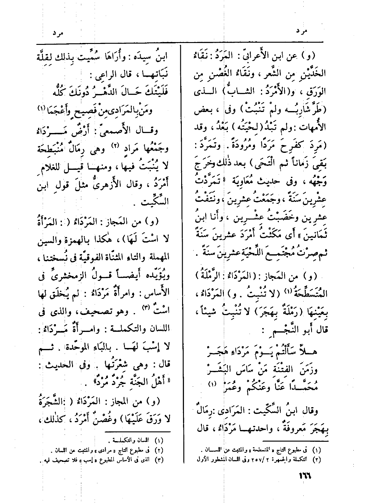 (و) من المَجاز: المَرْدَاءُ (: المَرْأَةُ لَا اسْتَ لَهَا) ، هاكذا بِالْهَمْزَةِ وَالسِّين الْمُهْملَة والتاءِ المثنّاة الفوقيّة فِي نُسختنا، ويُؤَيّده أَيضاً قولُ الزمخشريِّ فِي الأَساس: وامرأَةٌ مَرْدَاءُ: لم يُخلَق لَهَا اسْتٌ. وَهُوَ تَصْحِيف، وَالَّذِي فِي اللِّسَان والتكملة: وامرأَةٌ مَرْدَاءُ: لَا إِسْبَ لهَا. بالبَاءِ الموحّدة. ثمَّ قَالَ: وَهِي شِعْرَتُها. وَفِي الحَدِيث: (أَهْلُ الجَنَّةِ جُرْدٌ مُرْدٌ) .