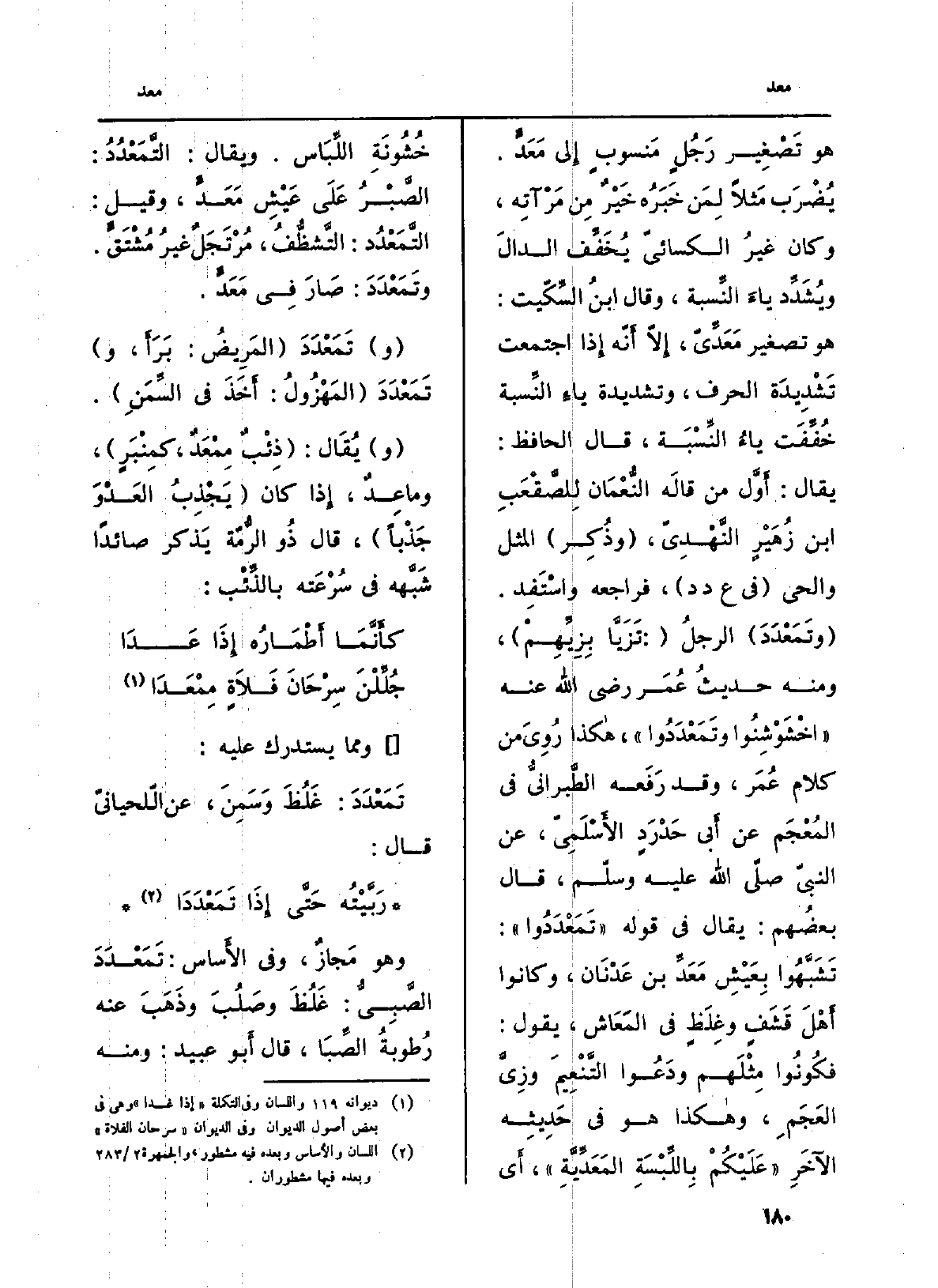 هُوَ تَصْغِير رَجُلٍ مَنسوبٍ إِلى مَعَدَ. يُضْرَب مَثلاً لِمَن خَبَرِ خَيْرٌ مِن مَرْآتِه، وَكَانَ غيرُ الكسائيّ يُخَفِّف الدالَ ويُشَدِّد ياءَ النِّسبة، وَقَالَ ابنُ السِّكّيت: هُوَ تَصْغِير مَعَدِّيّ، إِلاّ أَنّه إِذا اجْتمعت تَشْدِيدَة الْحَرْف، وتشديدة ياءِ النِّسبة خُفِّفَت ياءُ النِّسْبَة، قَالَ الْحَافِظ: يُقَال: أَوَّل من قالَه النّعْمَان للِصَّقْعَبِ ابْن زُهَيْرٍ النَّهْدِيّ، (وذُكِر) الْمثل والحي (ف ع د د) ، فَرَاجعه واسْتَفِد. (وتَمَعْدَدَ) الرجلُ (: تَزَيصا بِزِيِّهِمْ) ، وَمِنْه حديثُ عُمَر رَضِي الله عَنهُ (اخْشَوْشِنُوا وتَمَعْدَدُوا) ، هاكذا رُوِيَ من كَلَام عُمَر، وَقد رَفَعه الطَّبرانيُّ فِي المُعْجَم عَن أَبي حَدْرَدٍ الأَسْلَمِيّ، عَن النبيّ صلى الله عَلَيْهِ وَسلم قَالَ بعضُهم: يُقَال فِي قَوْله (تَمَعْدَدُوا) : تَشَبَّهُوا بِعَيْشِ مَعَدِّ بن عَدْنَان، وَكَانُوا أَهْلَ قَشَبٍ وغِلَظٍ فِي المَعَاش، يَقُول: فكُونُوا مِثْلَهم ودَعُوا التَّنْعِيمَ وزِيَّ العَجَمِ، وهاكذا هُوَ فِي حَدِيثِه الآخَرِ (عَلَيْكُمْ بِاللِّبْسَةِ المَعَدِّيَّةِ) ، أَي خُشُونَةِ اللِّبَاس. ... وَيُقَال: التَّمَعْدُدُ: الصَّبْرُ عَلَى عَيْشِ مَعَدَ، وَقيل: التَّمَعْدُد: التَّشظّفُ، مُرْتَجَلٌ غيرُ مُشْتَقَ. وتَمَعْدَدَ: صَارَ فِي مَعَدَ.