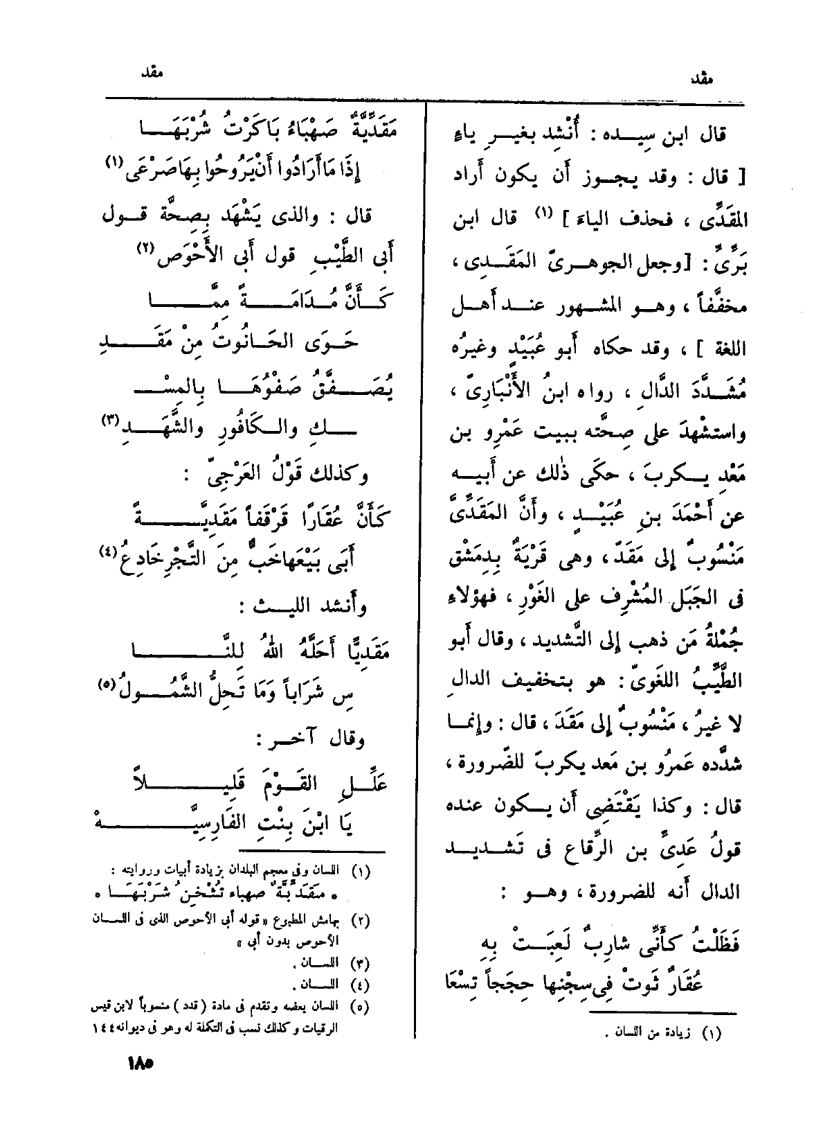 قَالَ ابْن سِيده: أُنْشِد بغيرِ ياءٍ (قَالَ: وَقد يجوز أَن يكون أَراد المقَدِّي، فَحذف الياءَ) قَالَ ابْن بَرِّيِّ: (وَجعل الجوهريّ المَقَدِي، مخفَّفاً، وَهُوَ الْمَشْهُور عِنْد أَهل اللُّغَة) ، وَقد حَكَاهُ أَبو عُبَيْدٍ وغيرُه مُشَدَّدَ الدَّالِ، رَوَاهُ ابنُ الأَنْبَارِيّ، واستشْهدَ على صِحَّته بِبَيْت عَمْرِو بن مَعْدِ يكربَ، حكَى ذالك عَن أَبيه عَن أَحْمَدَ بنِ عُبَيْدٍ، وأَنَّ المَقَدِّيَّ مَنْسُوبٌ إِلى مَقَدّ، وَهِي قَرْيَةٌ بِدِمَشْق فِي الجَبَل المُشْرِف على الغَوْرِ، فهؤلاءِ جُمْلَةُ مَن ذهب إِلى التَّشديد، وَقَالَ أَبو الطَّيِّبُ اللغَويّ: هُوَ بتَخْفِيف الدالِ لَا غيرُ، مَنْسُوبٌ إِلى مَقَدَ، قَالَ: وإِنما شدَّده عَمرُو بن مَعد يكربَ للضّرورة، قَالَ: وَكَذَا يَقْتَضِي أَن يكون عِنْده قولُ عَدِيِّ بن الرِّقاع فِي تَشديد الدَّال أَنه للضَّرُورَة، وَهُوَ: