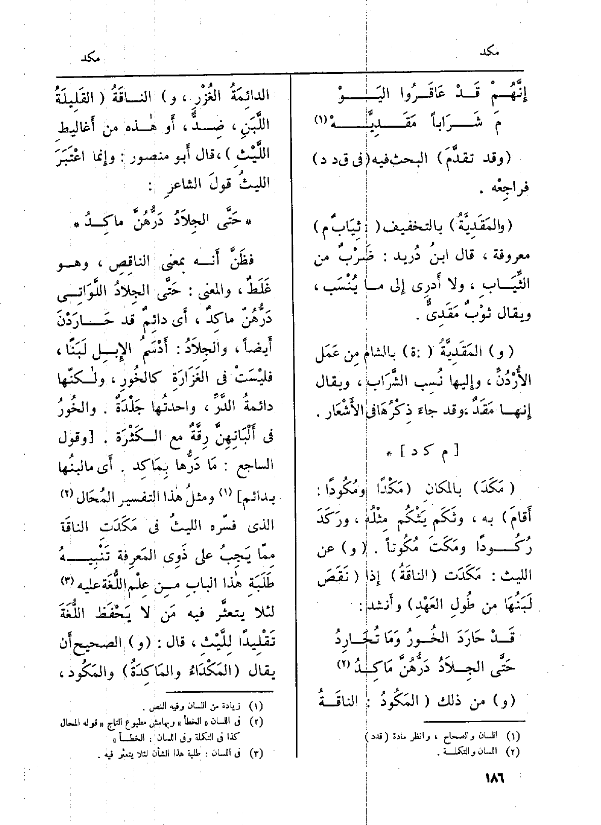 فظَنَّ أَنه بِمَعْنى الناقِصِ، وَهُوَ غَلَطٌ، وَالْمعْنَى: حَتَّى الجِلادُ اللَّوَاتِي دَرُّهُنّ ماكِدٌ، أَي دائِمٌ قد حَارَدْنَ أَيضاً، والجِلاَدُ: أَدْسَمُ الإِبِل لَبَناً، فليْسَتْ فِي الغَزَارَةِ كالخُورِ، ولاكنّها دائمةُ الدَّرِّ، واحدتُها جَلْدَةٌ، والخُورُ فِي أَلْبَانِهِنَّ رِقَّةٌ مَعَ الكَثْرَة. (وَقَول الساجع: مَا دَرُّها بِمَاكِد. أَي مَا لبنُها بدائم) ومثلُ هاذا التَّفْسِير المُحَال الَّذِي فسّره الليثُ فِي مَكَدَتِ الناقَة مِمّا يَجِبُ على ذَوِي المَعرِفة تَنْبِيهُ طَلَبَةِ هاذا البابِ مِن عِلْم اللُّغَة عَلَيْهِ لِئَلَّا يتعثَّر فِيهِ مَن لَا يَحْفَظ اللّغَةَ تَقْلِيداً لِلَّيْثِ، قَالَ: (و) الصَّحِيح أَن يُقَال (المَكْدَاءُ والمَاكِدَةُ) والمَكُود،