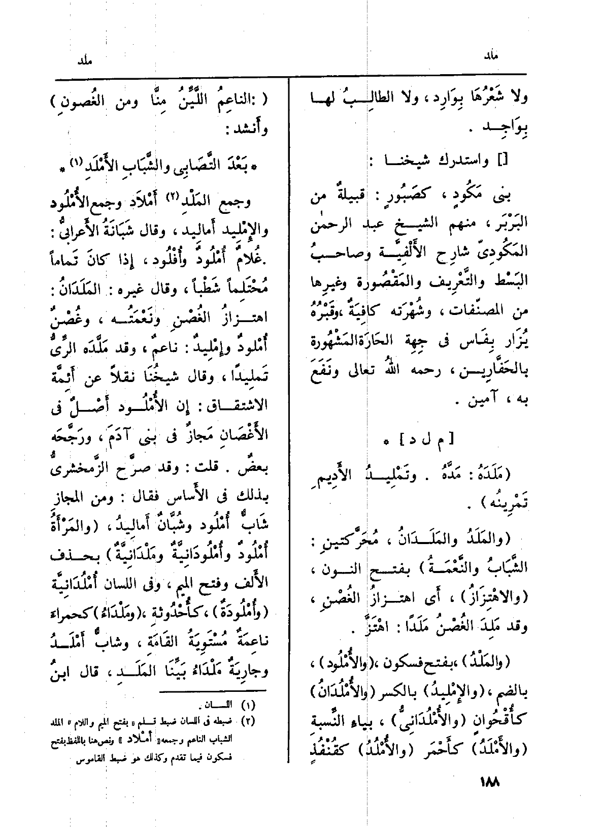 وَجمع المَلْدِ أَمْلاَد وَجمع الأُمْلُود والإِمْلِيد أَمالِيد، وَقَالَ شَبَانَةُ الأَعرابيُّ: غُلامٌ أُمْلُوٌ وأُفْلُود، إِذا كانَ تَماماً مُحْتَلِماً شَطْباً، وَقَالَ غَيره: المَلَدَانُ: اهتزازُ الغُصْنِ ونَعْمَتُ، وغُصْنٌ أُمْلودٌ إِمْلِيدٌ: ناعمٌ، وَقد مَلَّدَه الرِّيُّ تَملِيداً، وَقَالَ شيخُنَا نقلا عَن أَئِمَّة الِاشْتِقَاق: إِن الأُمحلُود أَصْلٌ فِي الأَغْصَانِ مَجازٌ فِي بني آدَمَ، ورجَّحَه بعضٌ. قلت: وَقد صرَّح الزَّمخشريُّ بذلك فِي الأَساس فَقَالَ: وَمن الْمجَاز شَابٌّ أُمْلُود وشُبَّانٌ أَمالِيدُ، (والمَرْأَةُ أُمْلُودٌ وأُمْلُودَانِيَّةٌ ومَلْدَانِيَّةٌ) بِحَذْف الأَلف وَفتح الْمِيم، وَفِي اللِّسَان أُمْلُدَانِيَّة (وأُمْلُودَةٌ) ، كأُحْدُوثةِ، (ومَلْدَاءُ) كحمراءَ ناعِمَةٌ مُسْتَوِيَةُ القَامَةِ، وشابٌّ أَمْلَدُ وجارِيَةٌ مَلْدَاءُ بَيِّنَا المَلَدِ، قَالَ ابنُ