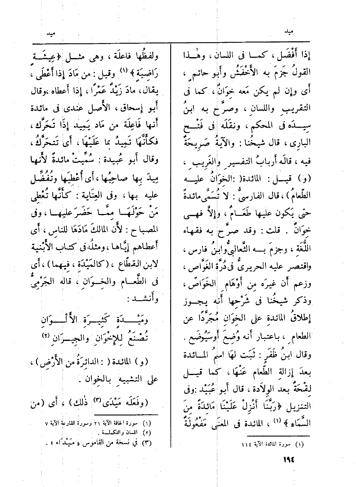 إِذا أَفْضَل، كَمَا فِي اللِّسَان، وهاذا القولُ جَزمَ بِهِ الأَخْفَشُ وأَبو حاتمٍ، أَي وإِن لم يكن مَعه خِوَانٌ، كَمَا فِي التَّقْرِيب واللسانِ، وصرَّح بِهِ ابنُ سِيدَه فِي الْمُحكم، ونقَلَه فِي فَتْح البارِي، قَالَ شيخُنا: والآيةُ صَرِيحَةٌ فِيهِ، قالَه أَربابُ التفسيرِ والغَرِيبِ، (و) قيل: الْمَائِدَة (: الخوَانُ عَلَيْهِ الطّعامُ) ، قَالَ الفارسيّ: لَا تُسَمَّى مائدةً حَتَّى يَكون عَلَيْهَا طَعَامٌ، وإِلاَّ فَهِيَ خِوَانٌ، قلت: وَقد صرَّح بِهِ فُقَهَاء اللُّغَةِ، وجزمَ بِهِ الثَّعالبيُّ وابنُ فَارس، وَاقْتصر عَلَيْهِ الحريريُّ فِي دُرَّة الغَوَّاص، وَزعم أَن غيرَه مِن أَوْهَامِ الخَوَاصّ، وَذكر شيخُنا فِي شَرْحِها أَنه يجوز إطلاقُ المائدةِ على الخِوَانِ مُجَرَّداً عَن الطعامِ، بِاعْتِبَار أَنه وُضِعَ أَو سَيُوضَع. وَقَالَ ابنُ ظَفَرٍ: ثَبَت لهَا اسمُ الْمَائِدَة بعدَ إِزالةِ الطّعام عَنْهَا، كَمَا قيل لِقْحَةٌ بعد الوِلاَدة، قَالَ أَبو عُبَيْد: وَفِي التَّنْزِيل: {رَبَّنَآ أَنزِلْ عَلَيْنَا {مَائِدَةً مّنَ السَّمَآء} (سُورَة الحاقة، الْآيَة: 21) ، الْمَائِدَة فِي المعنَى مَفْعُولَةٌ ولفظُها فاعلَة، وَهِي مثل {عِيشَةٍ رَّاضِيَةٍ} (سُورَة الحاقة، الْآيَة: 21) وَقيل: من مَادَ إِذا أَعْطَى، يُقَال، مادَ زَيْدٌ عَمحراً، إِذا أَعطاه، وَقَالَ أَبو إِسحاق، الأَصل عِنْدِي فِي مائدة أَنها فَاعِلَة من مَاد يَمِيد إِذَا تَحَرَّك، فكأَنَّهَا تَمِيدُ بِمَا عَلَيْهَا، أَي تَتحَرَّكُ، وَقَالَ أَبو عُبيدة: سُمِّيتْ مائدةً لأَنها مِيدَ بِها صاحِبُها، أَي أُعْطِيَها وتُفُضِّل عَلَيْهِ بهَا، وَفِي العِنَاية: كأَنَّها تُعْطِي مَنْ حَوْلَهَا مِمَّا حَضَرَ عَلَيْهَا، وَفِي الْمِصْبَاح: لأَ المالكَ مَادَهَا للناسِ، أَي أَعطاهم إيَّاها، ومثلُه فِي كتاب الأَبْنية لِابْنِ القطّاع، (} كالمَيْدَةِ، فِيهما) ، أَي فِي الطَّعام والخِوَانِ، قَالَه الجَرْمِيُّ وأَنشد: