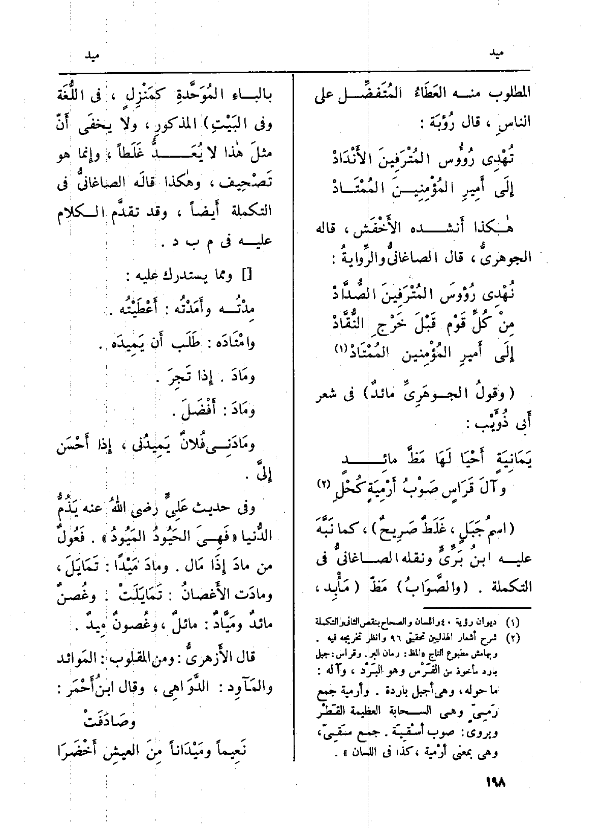 وَفِي حَدِيث عَلِيَ رَضِي الله عَنهُ يَذُمُّ الدُّنيا (فَهِيَ الحَيُودُ {المَيُودُ) . فَعُولٌ من} مادَ إِذَا مَال. {ومادَ} مَيْداً: تَمَايَلَ، {ومادَت الأَغصانُ: تَمَايَلَتْ. وغُصنٌ} مائدٌ {ومَيَّادٌ: مائلٌ، وغُصونٌ} مِيدٌ.