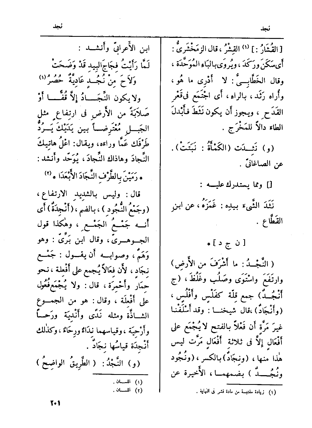 : (النَّجْدُ: مَا أَشْرَفَ من الأَرضِ) وارتَفَعَ واسْتَوَى وصَلُب وغَلُظَ، (ج أَنْجُدٌ) جمع قِلّة كفَلْسٍ وأَفْلُسٍ، (وأَنْجَادٌ) ، قَالَ شَيخنَا: وَقد أَسْلَفْنا غيرَ مَرَّةٍ أَن فَعْلاً بِالْفَتْح لَا يُجْمَع على أَفْعَالٍ إِلاَّ فِي ثلاثةِ أَفْعَالٍ مَرَّت لَيْسَ هاذا مِنْهَا؛ (ونِجَادٌ) بِالْكَسْرِ، (ونُجُود ونُجُدٌ) بضمهما، الأَخيرة عَن ابْن الأَعرابيّ وأَنشد: