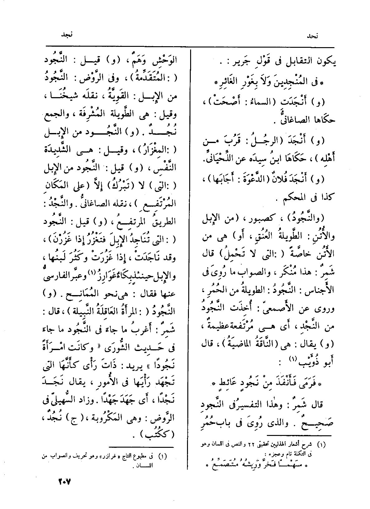 قَالَ شَمِرٌ: وهاذا التفسيرُ فِي النَّجودِ صَحِيحٌ. وَالَّذِي روِيَ فِي بَاب حُمُرِ الوَحْشِ وَهَمٌ، (و) قيل: النَّجُود (: المُتَقَدِّمةُ) ، وَفِي الرَّوْض: النَّجُودُ من الإِبل: القَوِيَّةُ، نقلَه شيخُنَا، وَقيل: هِيَ الطَّويلة المُشْرِفَة، وَالْجمع نُجُدٌ. (و) النَّجُود من الإِبل (: المِغْزَارُ) ، وَقيل: هِيَ الشَّدِيدَة النَّفْسِ، (و) قيل: النَّجُود من الإِبل (: الَّتِي) لَا (تَبْرُكُ) إِلاَّ (على المَكَانِ المُرْتَفِعِ) ، نَقله الصاغانيُّ. والنَّجْدُ: الطريقُ المرتفِعُ، (و) قيل: النَّجُود (: الَّتِي تُنَاجِدُ الإِبِلَ فتَغْزُرُ إِذا غَزُرْنَ) ، وَقد نَاجَدَتْ، إِذا غَزُرَتْ وكَثُرَ لَبنُها، والإِبل حينئذٍ بِكَاءٌ غَوَارِزُ وعبَّر الفارسيُّ عَنْهَا فَقَالَ: هِيَ نَحْو المُمَانِح. (و) النَّجُودُ (: المرأَةُ العَاقِلةُ النَّبِيلة) ، قَالَ شَمِرٌ: أَغربُ مَا جاءَ فِي النَّجُود مَا جاءَ فِي حَدِيث الشُّورَى (وكانَت امْرَأَةً نَجُوداً) يُرِيد: ذَاتَ رَأْى كأَنَّهَا الَّتِي تَجْهَد رَأْيَها فِي الأُمورِ، يُقَال نَجَدَ نَجْداً، أَي جَهَدَ جَهْداً. وَزَاد السُّهيل فِي الرَّوض: وَهِي المَكْرُوبة، (ج) نُجُدٌ، (ككُتُب) .