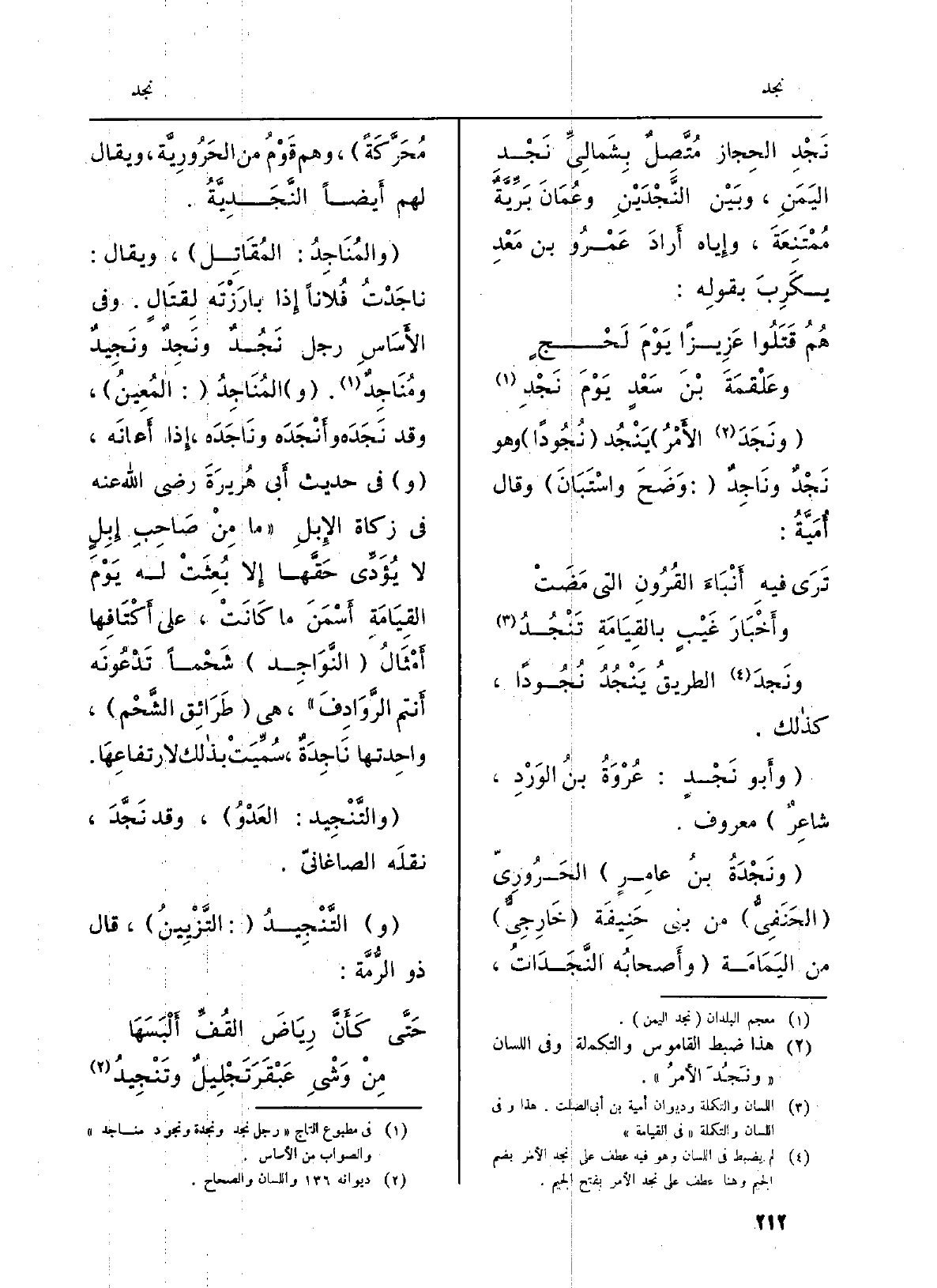 (ونَجَدَ الأَمْرُ) يَنْجُد (نُجُوداً) وَهُوَ نَجْدٌ ونَاجِدٌ (: وَضَحَ واسْتَبَانَ) وَقَالَ أُمَيَّةُ: